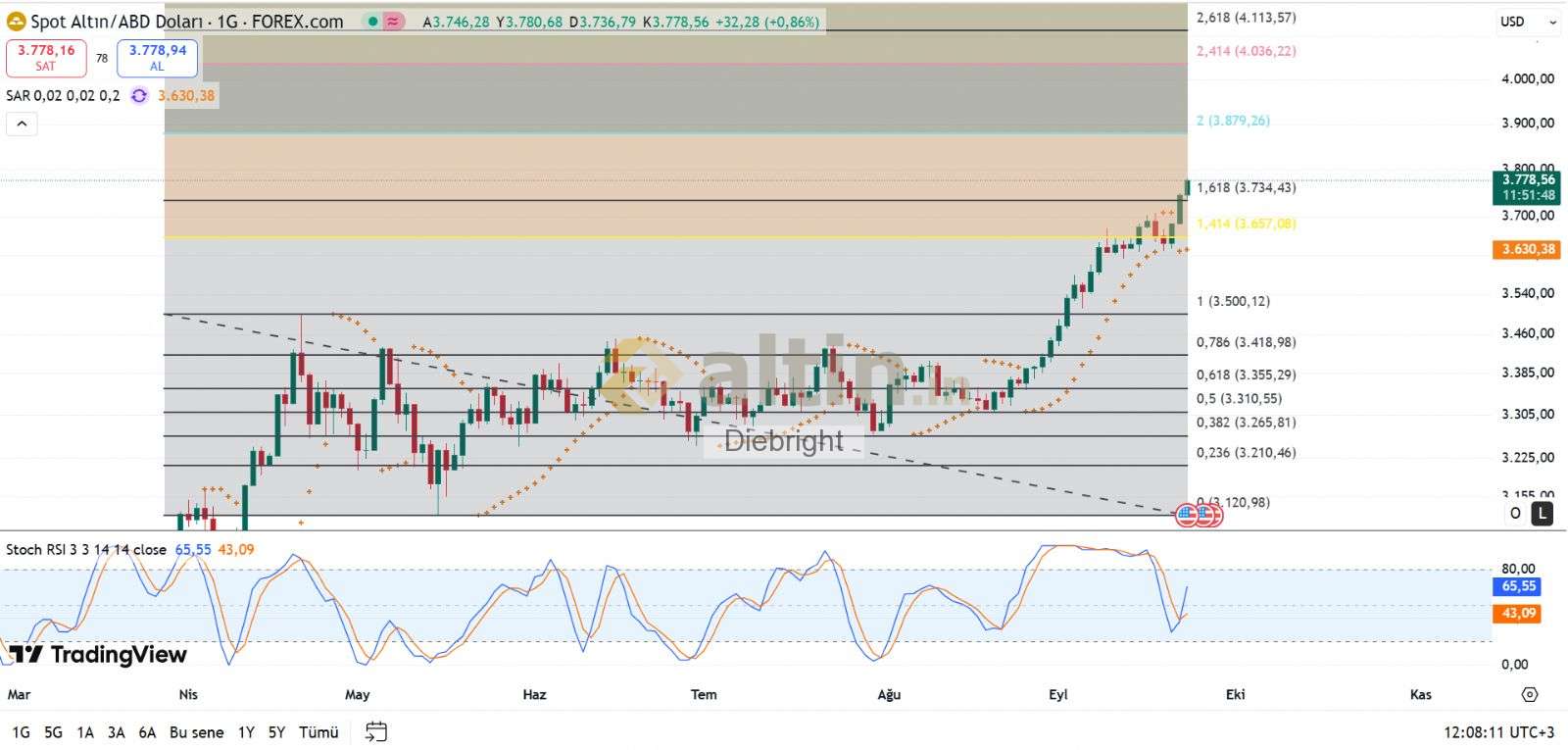 Diebright ()Olabilir. 3800 usd formasyon hedefi geldikten sonra tabi belli olur bence. Daralan üçgeni kırdı ve bunun hedefi 3799-3800 usd civarı idi. Oraya yaklaştık. Hedef tamamlanma sonrasında geri çekilme olmazsa bu kez fibo hedefine yani 3879 usdye gider. Altın haftalık grafik zaten orta uzun vade için yükselişe çok uygun.