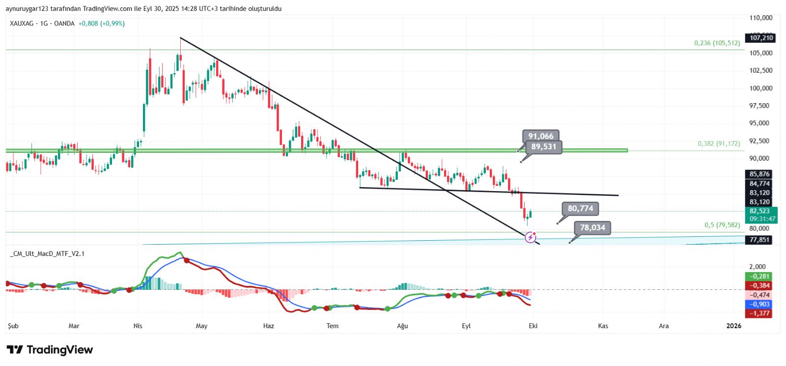TUĞRA44 ()Bu günlük henüz temas yok 4 saatlikte farklı tam temas var 80.4 ile. Yatay çizgi 85.867 fibo değeri evet direnç oldu şimdi. 80.065 destek. Burada farklı noktalarda var ama trend gibi meselâ. Oda 77 78 biliyorsun sen onu. Ben 2024 te 72.6 ile noktasal yakaladım onu strongwolf te iyi biliyor oda takipte idi ama o daha farklı noktayı takip ediyordu değer olarak ben tam yakaladım. Bunlar ayrı mesele ama düşeni senle farklı izliyoruz ben son 2 tepeden çekiyorum sen farklı çekiyorsun doğru olan 2 tepeden gelendir bence.