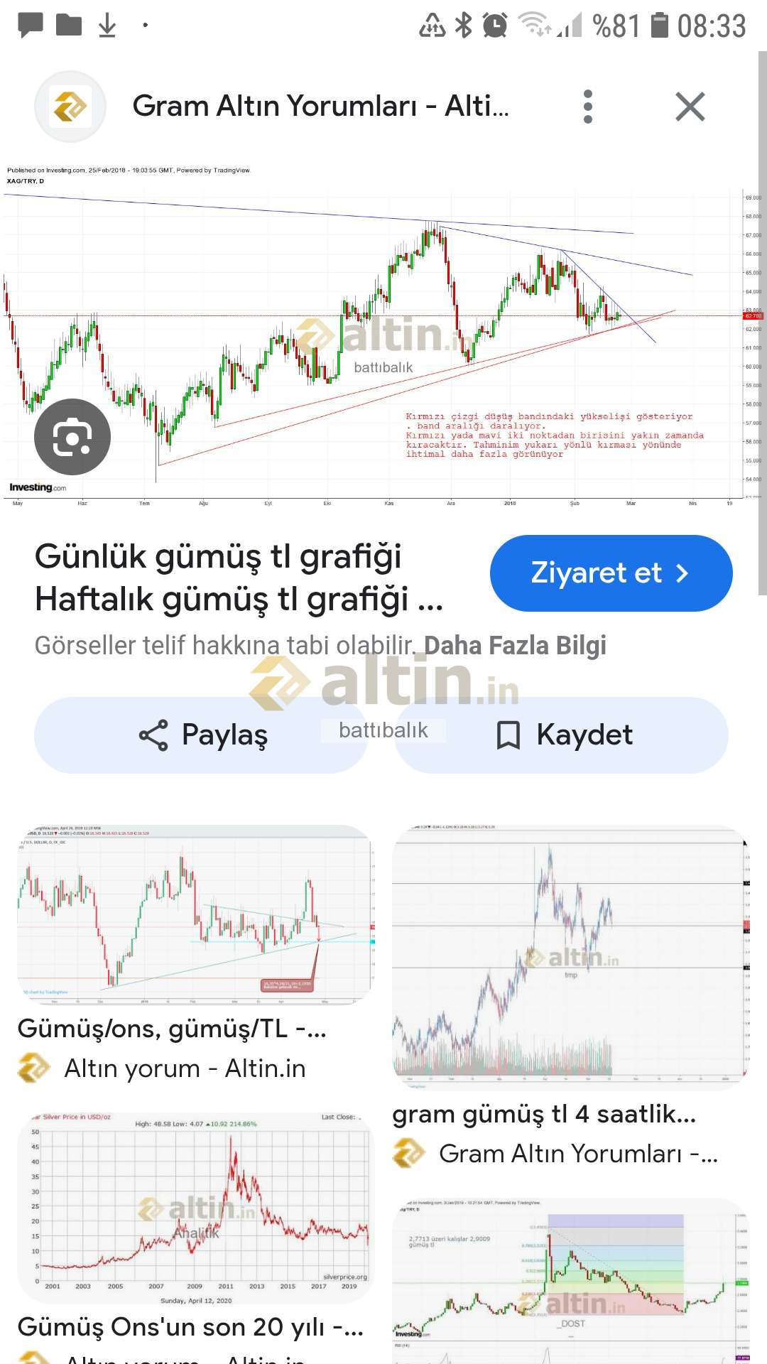 battıbalık ()Vahap vardı umtce vardı. Çok iyi yorumcular vardı. Ben sizin grafikleri elif hanımın grafiklerine benzetiyorum. Grafik çalışmanız benzer. Bu arada kapanış Boğa sinyalini verdi. Bollingeri yukarı genişletip indikatörleri düzeltip yukarı devam edecek. Ben 4 gün önce bundan emin olmuştum yazdım. Aslında 10 gün önce gördüm. Temel abi ile çok sohbetimiz oldu. Metaller ile ilgili çok bilgi vermişti. Umtce grafikleri öğretmişti. Benim temel yorum kuvvetliydi. Sonra Hikmet Baydar hocam bir pdf dosyası yolladı. Mum grafikleri bazı notlar vs... bunları dikkatle inceledim. Çok şey kattı. Günlük bakarken indikatörleri açmadan bollinger bandına bakarak buraya gider der hale geldim. Gerçi uzun vadede bir analiz yaptım. Bu doğrultuda gidiyor.
