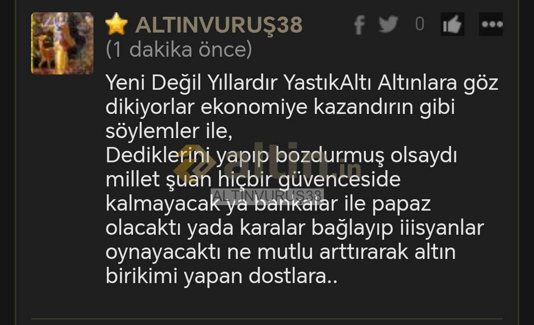 1) Altin.in'de yer alan içeriğin doğru ve/veya güncel olduğu hiçbir şekilde iddia veya garanti edilmemekte, hiçbir veri ve/veya paylaşım, yatırım danışmanlığı kapsamına girmemektedir. Sitenin içeriği referans alınarak yapılacak hiçbir işlemin doğuracağı maddi ve/veya manevi herhangi bir kayıptan altin.in sorumlu değildir. 2) Altin.in ziyaretiniz sırasında ip adresiniz ve bilgisayarınız aracılığıyla toplanabilen diğer veriler altin.in tarafından kayıt altında tutulmaktadır. 3) Altin.in tüm içeriği önceden uyarmaksızın değiştirme, kaldırma ve yenilerini ekleme hakkına sahiptir. 4) Altin.in gerekli gördüğü taktirde üyelerin ip numaralarını engelleme hakkına sahiptir. 5) Altin.in yorumlar bölümünde ki içerik, görsel, yorum ve paylaşımlar (tarafımızdan onaylanmaksızın) kullanıcılar tarafından kendi iradeleri ile paylaşılmaktadır. Bu içeriklerden dolayı doğabilecek hukuksal konulardan içeriği oluşturan kullanıcı sorumlu olacaktır. 6) Altin.in'in tüm kullanıcıları 5651 Sayılı Kanunun 8. ile 9. Maddesine ve TCK'nın 125. maddesine göre yaptıkları paylaşımlardan kendileri sorumludur. Bu bağlamda altin.in hukuksal haklarını saklı tutar. 7) Bu uyarılar önceden haber verilmeksizin değişkenlik gösterebilir takibi kullanıcılarımızın sorumluluğundadır.