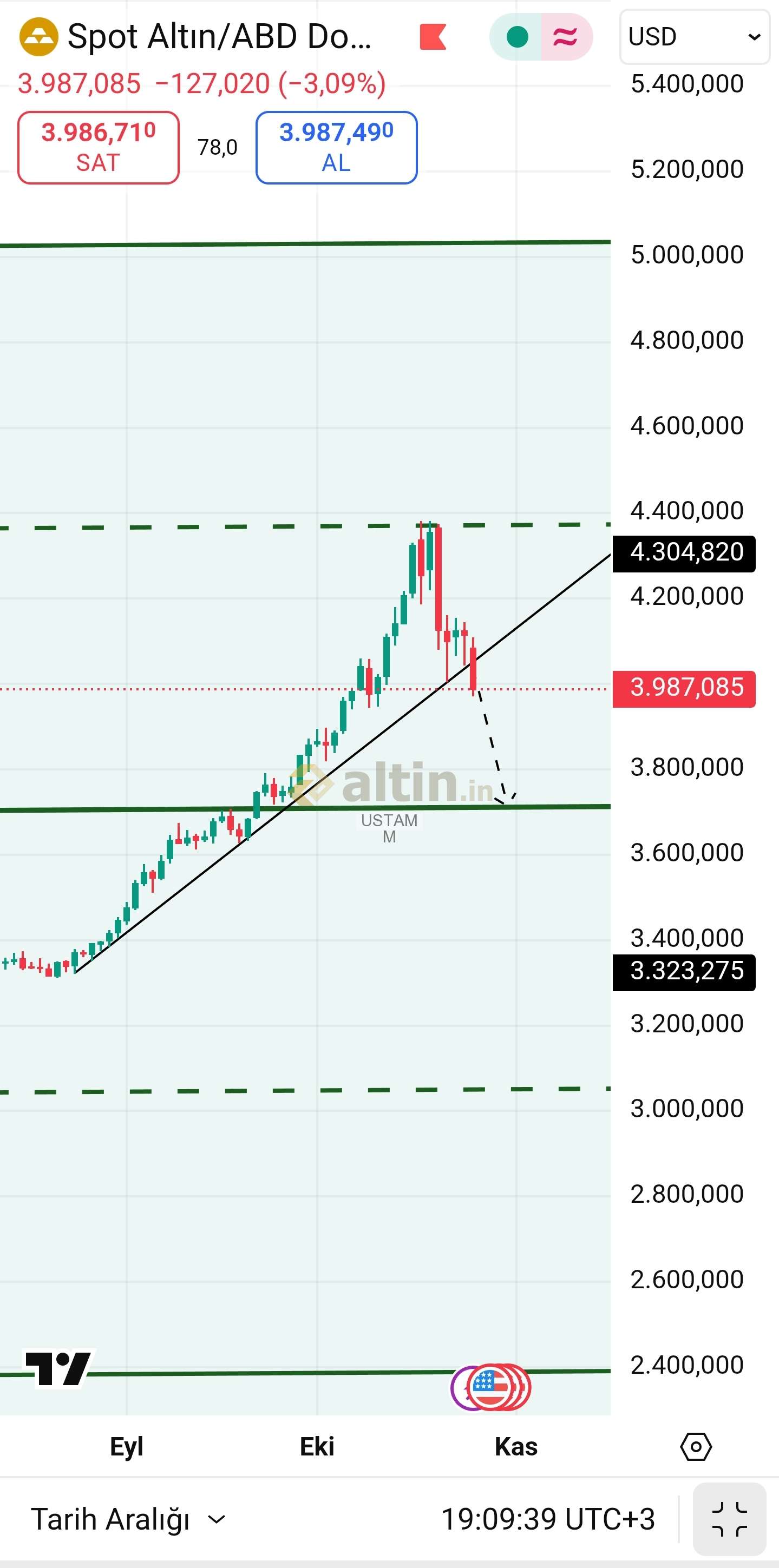 USTAMM ()Grafikte görüldüğü gibi kanal orta çizgisi direncini kirabilseydi 5000 dolar üstüne gidebilirdi.