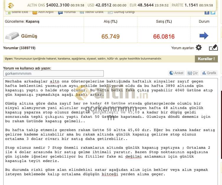 1) Altin.in'de yer alan içeriğin doğru ve/veya güncel olduğu hiçbir şekilde iddia veya garanti edilmemekte, hiçbir veri ve/veya paylaşım, yatırım danışmanlığı kapsamına girmemektedir. Sitenin içeriği referans alınarak yapılacak hiçbir işlemin doğuracağı maddi ve/veya manevi herhangi bir kayıptan altin.in sorumlu değildir. 2) Altin.in ziyaretiniz sırasında ip adresiniz ve bilgisayarınız aracılığıyla toplanabilen diğer veriler altin.in tarafından kayıt altında tutulmaktadır. 3) Altin.in tüm içeriği önceden uyarmaksızın değiştirme, kaldırma ve yenilerini ekleme hakkına sahiptir. 4) Altin.in gerekli gördüğü taktirde üyelerin ip numaralarını engelleme hakkına sahiptir. 5) Altin.in yorumlar bölümünde ki içerik, görsel, yorum ve paylaşımlar (tarafımızdan onaylanmaksızın) kullanıcılar tarafından kendi iradeleri ile paylaşılmaktadır. Bu içeriklerden dolayı doğabilecek hukuksal konulardan içeriği oluşturan kullanıcı sorumlu olacaktır. 6) Altin.in'in tüm kullanıcıları 5651 Sayılı Kanunun 8. ile 9. Maddesine ve TCK'nın 125. maddesine göre yaptıkları paylaşımlardan kendileri sorumludur. Bu bağlamda altin.in hukuksal haklarını saklı tutar. 7) Bu uyarılar önceden haber verilmeksizin değişkenlik gösterebilir takibi kullanıcılarımızın sorumluluğundadır.