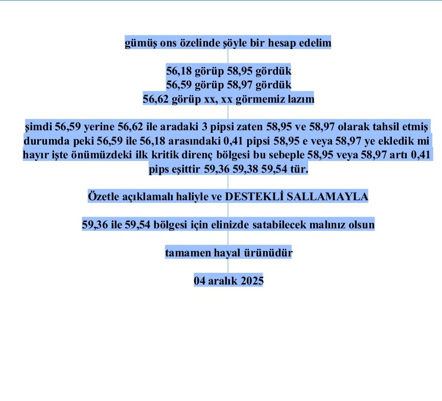 yükselmesi için düşüş yaşaması ve kendisine yeni bir kanal açması gerekir bunu yaparken de yolcu silkeleyip tepeye mümkün olan en az sayıda kişiyi götürmek. Bu minvalde eğer büyük tepe bitmedi ve büyük tepeye gitmesi için düşüyorsa sabah bahsettiğim 54,23-54,09 bölgesi üzerinde durdukça pozitifliğini koruyacaktır. Hele hele 55,80 üzeri duruyor ya kaç gündür yanına bile yaklaşmadı ya işte bu çok daha pozitif olduğunu gösteriyor. Ons ları etkileyen ilk 5 etken ne deseniz ilk beşin içine dxy ve abd tahvil faizleri ile fed faiz kararları girer. Bu üç etken hala onsların lehine olmaya devam ediyor. Bu durumda her düşüş alım fırsatı yaratıyor demektir arkadaşım. tamamen hayal ürünüdür