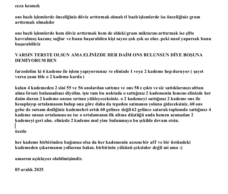 HÜMANİST_ ()benimkisi bir alışkanlık arkadaşım yıllar yıllar evvel tfx target varken günde en az 3 bazen 5 işlem açıp kapatıyordum ve taa oralardan gelen bir al sat alışkanlığı sebebiyle günlük al sat rakamlarına bakarak sizlerle paylaşıyorum. aynı gün içinde al sat yapmak artık eskisi kadar kolay olmasa da halen yapılabilir bir gerçek olarak duruyor. işin doğrusu ise şu olmalıdır.