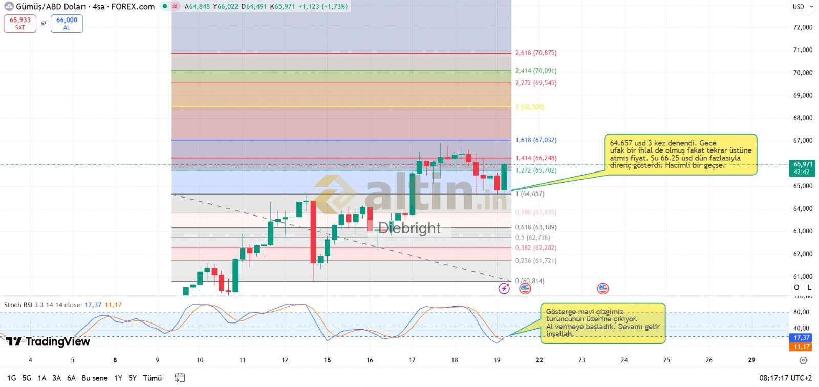 Diebright ()Merhaba. Bugün biraz daha 4300 usd civarına satış yese iyi olur. Bir veya iki 4 saatlik kırmızı mum kapanışı alsak fena olmaz.4 saatlik gösterge Altın onsta da dip yapar bu sayede. Ondan sonra da yukarı 4381 usdyi kırmaya gider. Ben açıkçası fiyatın 4276 usd hatta 4300 usd üzeri olması yetiyor bana göre yukarı gitmesi için.