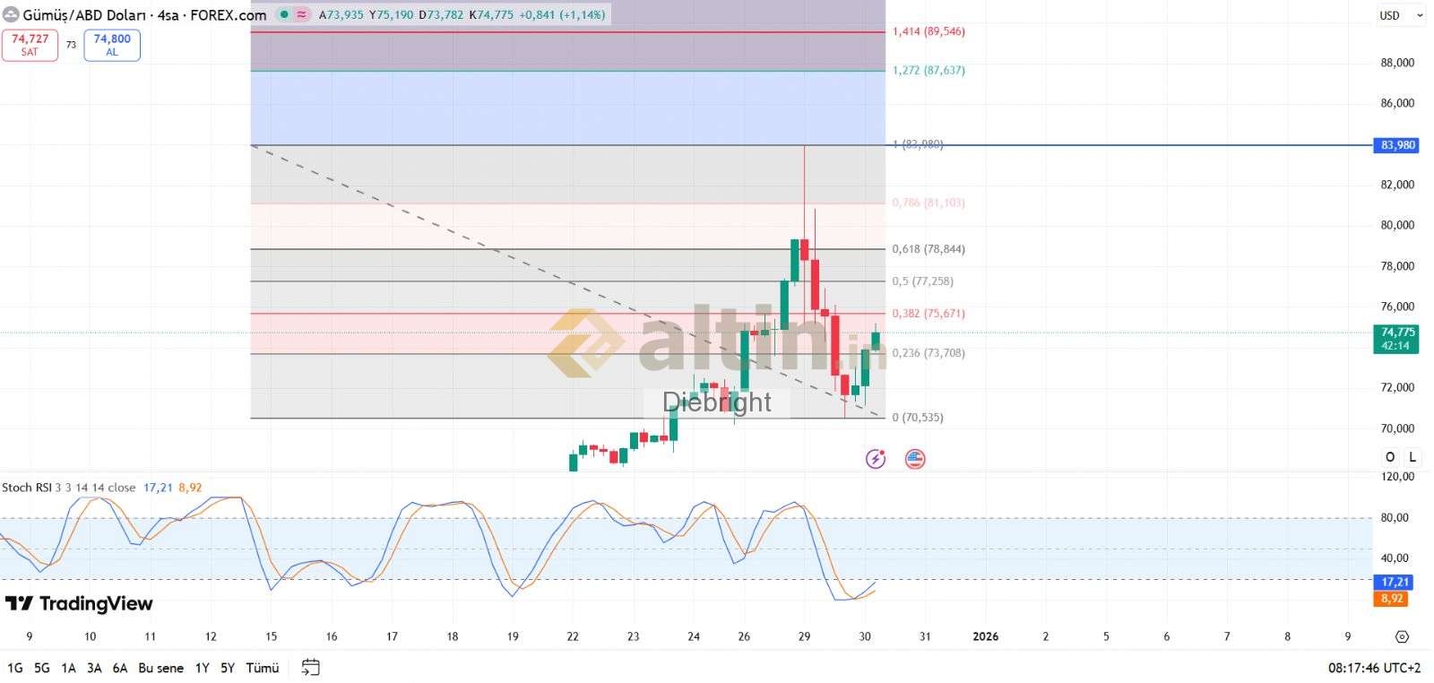 Diebright ()En azından 73.71 usd üzerinde kalmalı. Tepkinin güçlenmesi için tepki seviyelerinin devamı gelmesi gerek. Bir üst seviye gelmedi hala. O da 75.67 usd. Kademe kademe bakacağız. Keşke 80-81 usd gelse de çıksak. Ancak kademe kademe bakacağız. Ben 100 TL civarından ilave yapıp al sat yaptım. 98 TL uygun yerdi keşke oradan alsaydık. 4 saatlik de dip yapmıştı. Şu an tepki alıyoruz. Yeni açılan 4 saatlik mum arada. Bu mum da olumluya dönerse 77.26 usd hatta belki 78.85 usd görürüz. Hareketin güçlü tepkiye hatta belki yeni zirveye dönüşü bu tepki seviyelerinin geçilmesi ile olur. 4 saatlik göstergeyi fazla şişirmeden inşallah gider ki momentumu kesmesin.