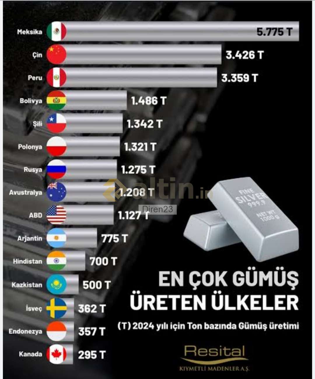 Diren23 ()Sanılanın Aksine Çin gümüş üreticisi olarak iyi bir konumda olmakla beraber en çok üreten ülke değildir. Çin Kısıtlama yaptı diye illa fiyatlar yükselecek diye birşey yok. Diğer üretici ülkeler arzı arttırdığında gümüşü aşağı yönlü etkileme ihtimali gözden kaçırılmaması gerekir. Mesela Petrolde politik nedenlerden dolayı bir üretici arzı kıstığında hemen ABD nin baskısıyla başka bir üretici Arz arttırıyor ve petrol fiyatları dengeleniyor. Kişisel görüşüm olup, yatırım tavsiyesi içermez.