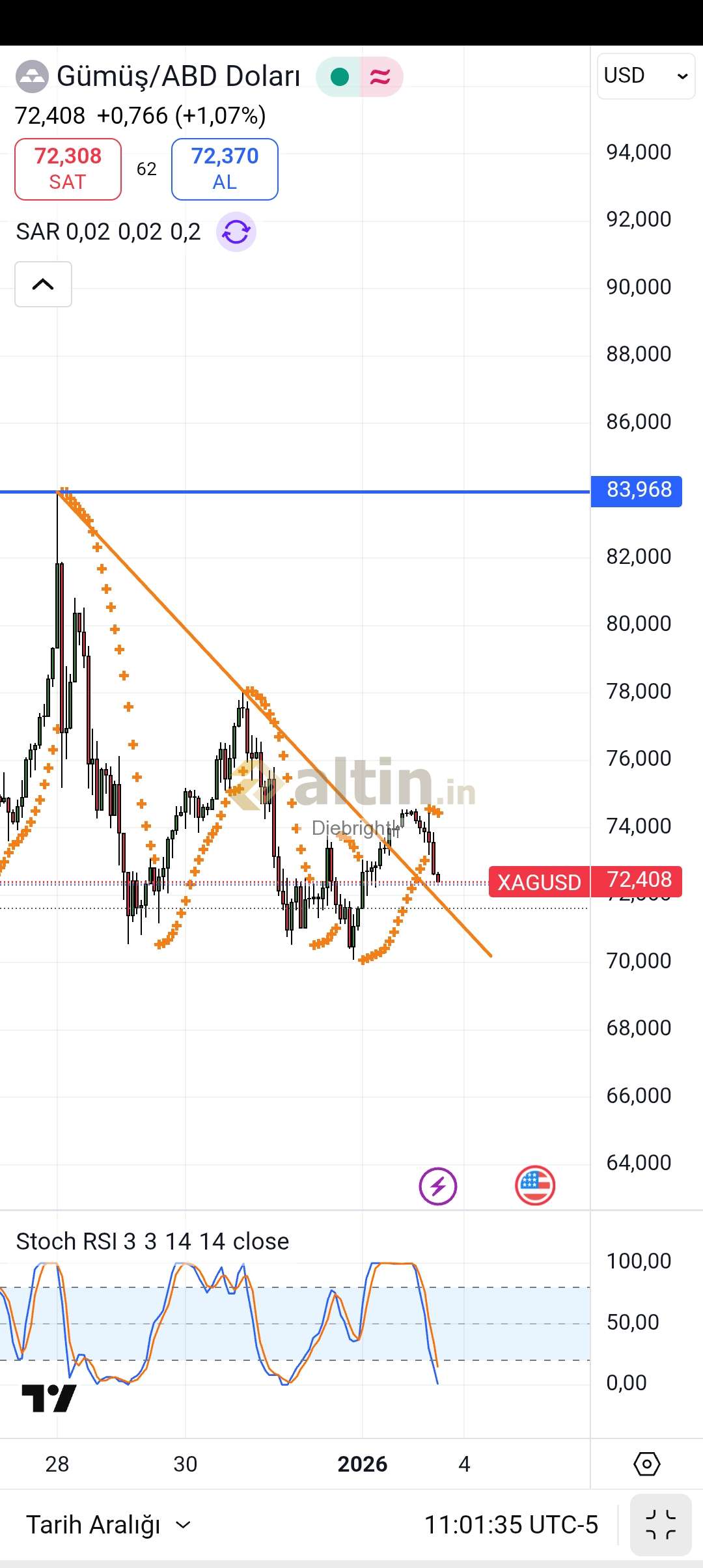 Diebright ()Kesişim olmuştu zaten. O yüzden de yükseldi. 4404 usd yi önceki tepe olarak takip ettik. 4402 usd ile satış gelmiş. Şimdi 4 saatlik gösterge bu sefer aşağı yönlü kesmek üzere. Gunluk mumda da cekic oluşumu var. Daha gün bitmedi bakalım. Mum hala yeşil ama tepeden vurmuşlar. Gunluk göstergesi kesişme için bugünü yeşil kapatmalı.