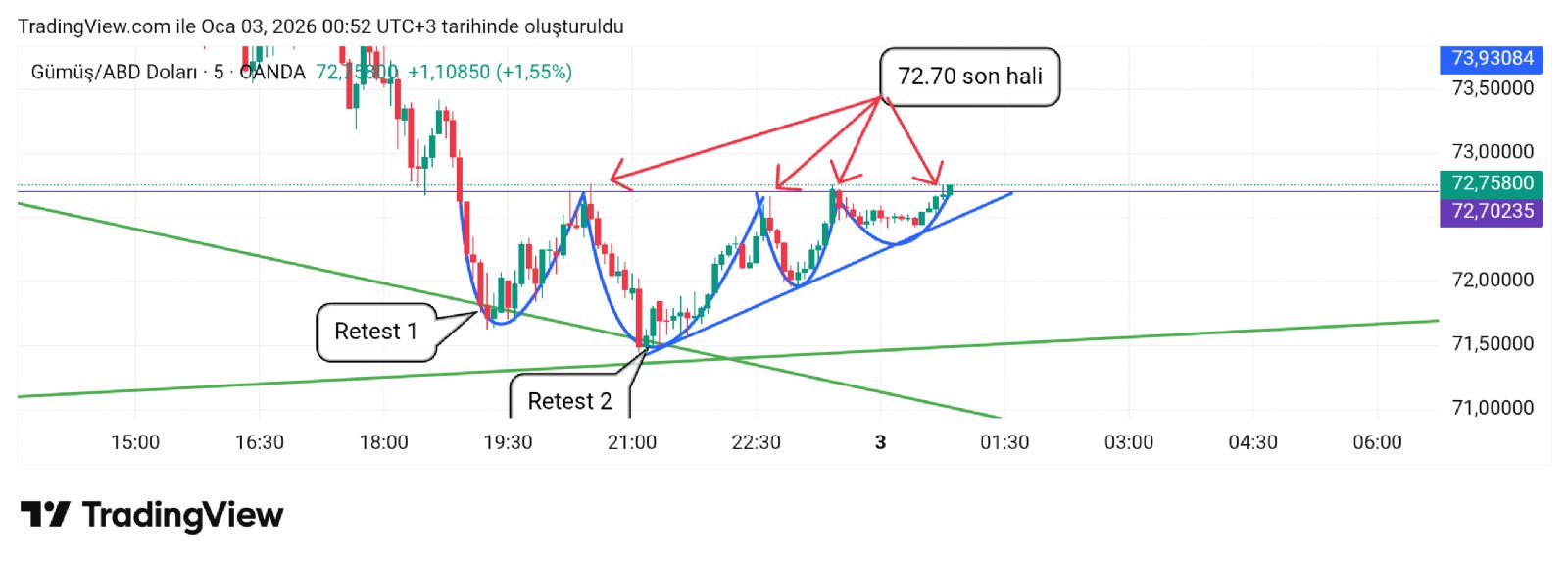 Hayalet_adam ()Pazartesi önce yükseliş sonra geri çekilme olur mu ona bakarız. Yükseliş olması lazım sanki ilk. Trend iyi dayandı yatay bantta 70 dediğimiz yer iyi destek oldu. Ama haftaya baya bir heyecanlı olacak gibi görünüyor. Hayırlısı olsun inşallah zararda olanların zararı çıkar.