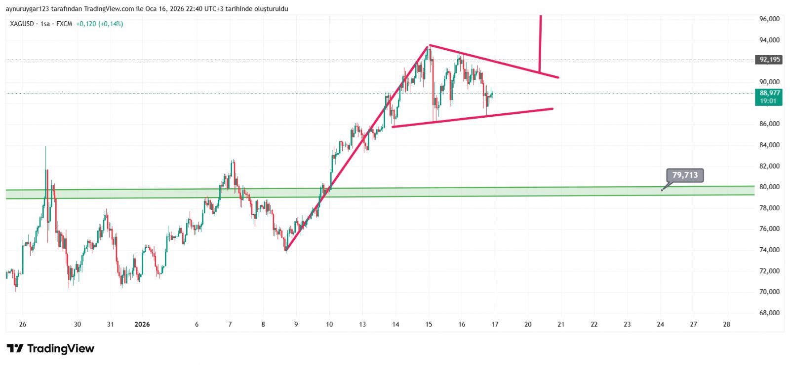 Silver_gr ()• Formasyon yükselen trend sonrası oluşmuş bir sıkışma (ayı bayrağı / daralan üçgen) gibi duruyor aşağı yönlü kırılma var gibi hocam dediğiniz yere gelebilir kama formasyonu