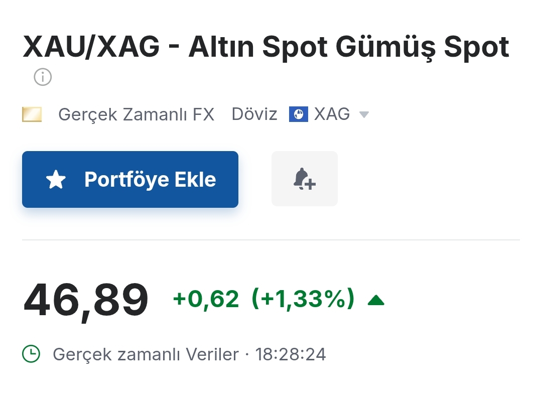 asosyalherif ()altını n ons fiyatını gümüşün ons fiyatına böl. değer yüksek çıkarsa altın gümüşten daha değerlidir, gümüş değersizdir anlamına geliyor. yani rasyonun yükselmesi iyi bişey değil gümüş açısndan