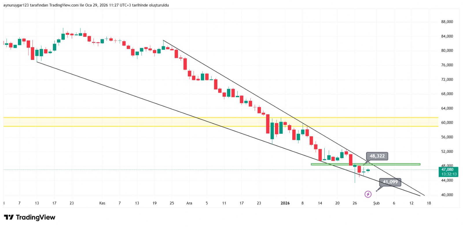 battıbalık ()Benim tahminim 3 yada 4 yıllık yükseliş trendi. Bu dümdüz yeşil mum olmaz. Arada satış gelir arada yatay gider. Yatay yukarı yatay aşağı yapar jeopolitik yada ekonomik riskler artar dik yukarı atar gap ile açar. Gao kapatır. Mumlar altdan üstden fitil bırakır. Her şey mümkün. Fiyatın bir noktada sıfırlanması bile imkansız değil.