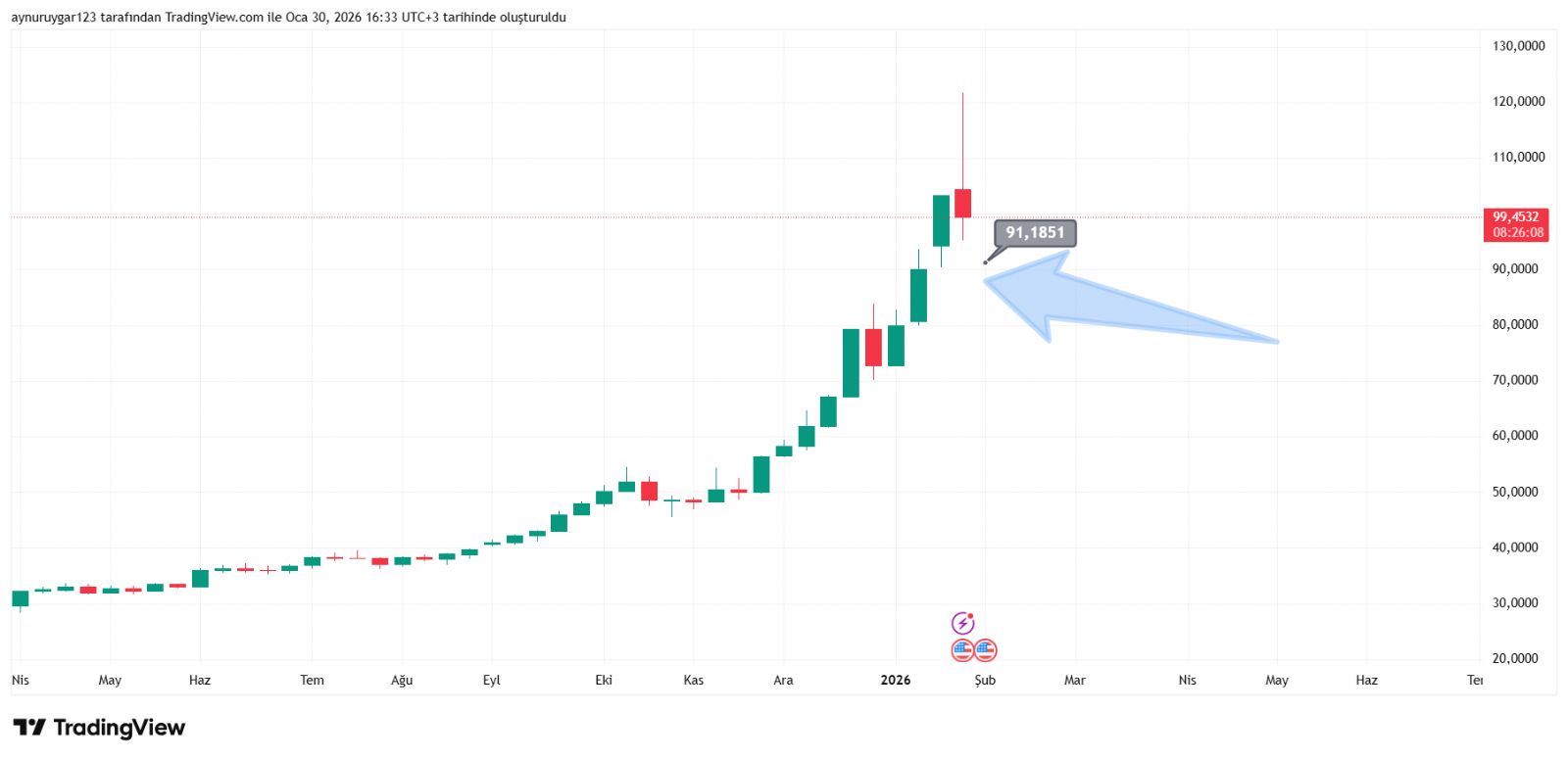 Thierry_Henry ()Ora yükselen kanal desteği aynı zamanda gelirse güzel fırsat olur piyasada her şey olabilir bende beklemiyorum ama beklemediğim yükselişleri de yaptı gümüş yani bu kadar hızlı bir ayda yüzde 70 kazanç vermesi mesela bir kaç saat içinde gümüşün yüzde 50 düştüğünü de gördü bu gözler toplama fırsatı hiçbirşey olmasa her ay maaştan artan ile almak lazım kademeli üzmez 100 dolar altıda