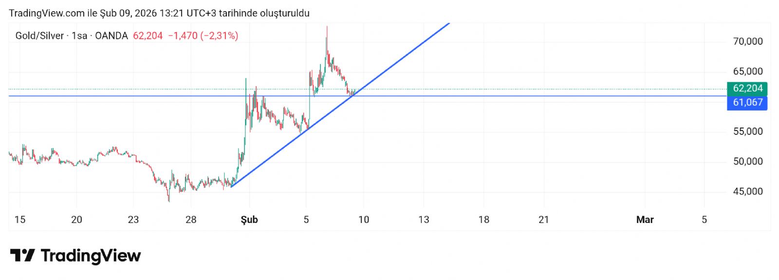 Hayalet_adam ()Takip etmek lazım 67-72-75 şeklinde 3 noktayı izlerim ben şahsen. Bu son tepeden sonra yükseleni alta atacaktır grafikte negatif uyumsuzluk (NU) mevcut bu illaki çalışır diye düşünüyorum. Şuan bir tepe daha yapsın bakalım nereye kadar gidecek. Ons gümüş 74-75 bi izleyelim ona karışılık gelen yerleri de rasyo da izleyelim ayrıca.