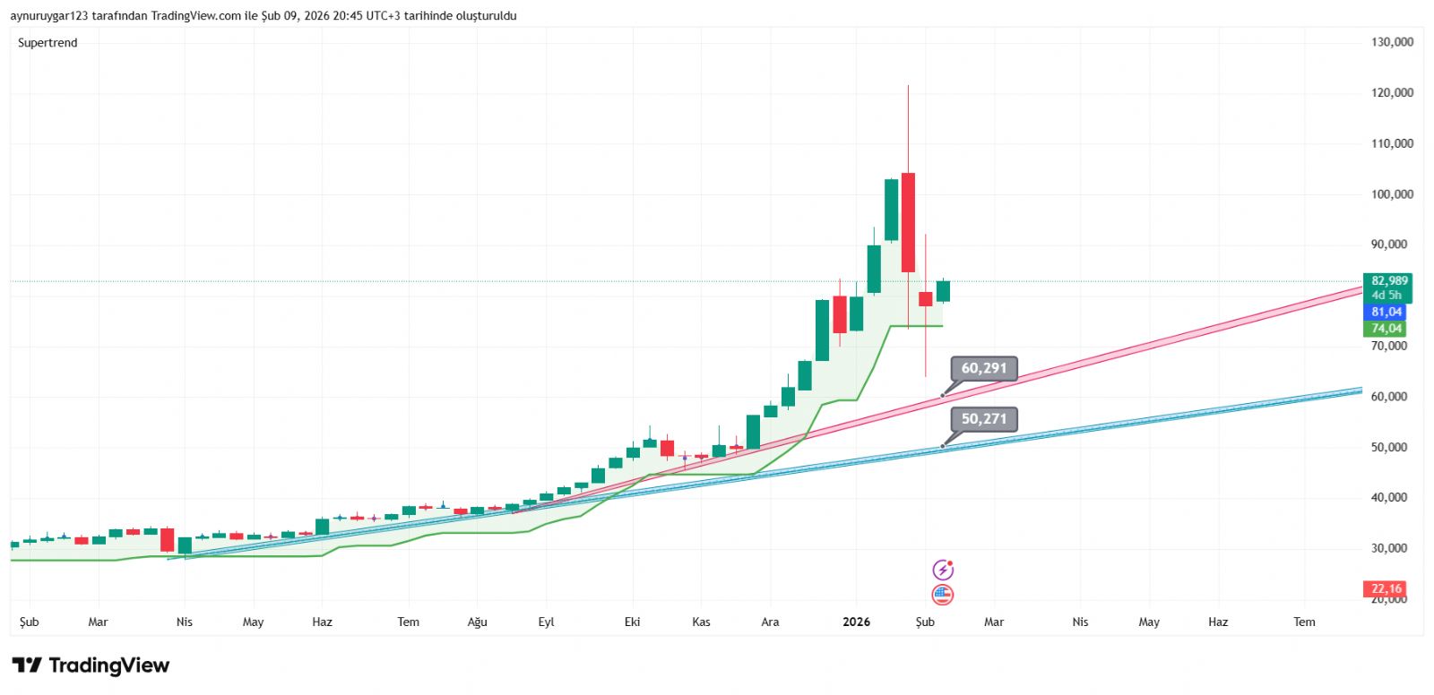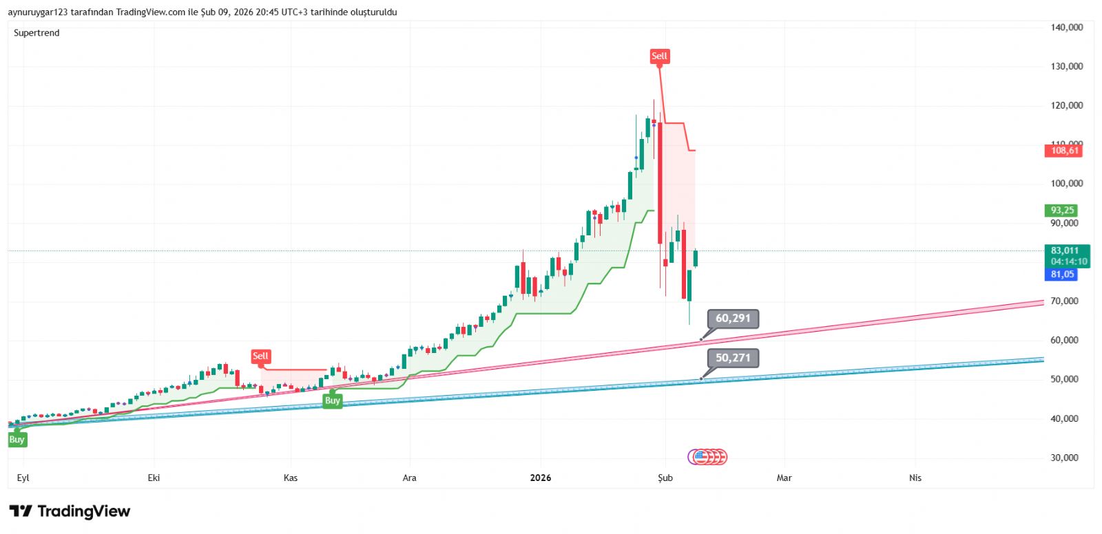 EmDi ()Grafiklere baktığımda genel trendin hala yukarı olduğunu ama son hızlı yükselişten sonra satışların geldiğini supertrendin de bunu sat sinyaliyle gösterdiğini ve fiyatın şu an 50–60 bin civarındaki önemli desteklere doğru geri çekildiğini, bu bölge tutarsa tekrar toparlanma olabileceğini ama kırılırsa düşüşün devam edebileceğini anlıyorum. Siz ne düşünüyorsunuz?
