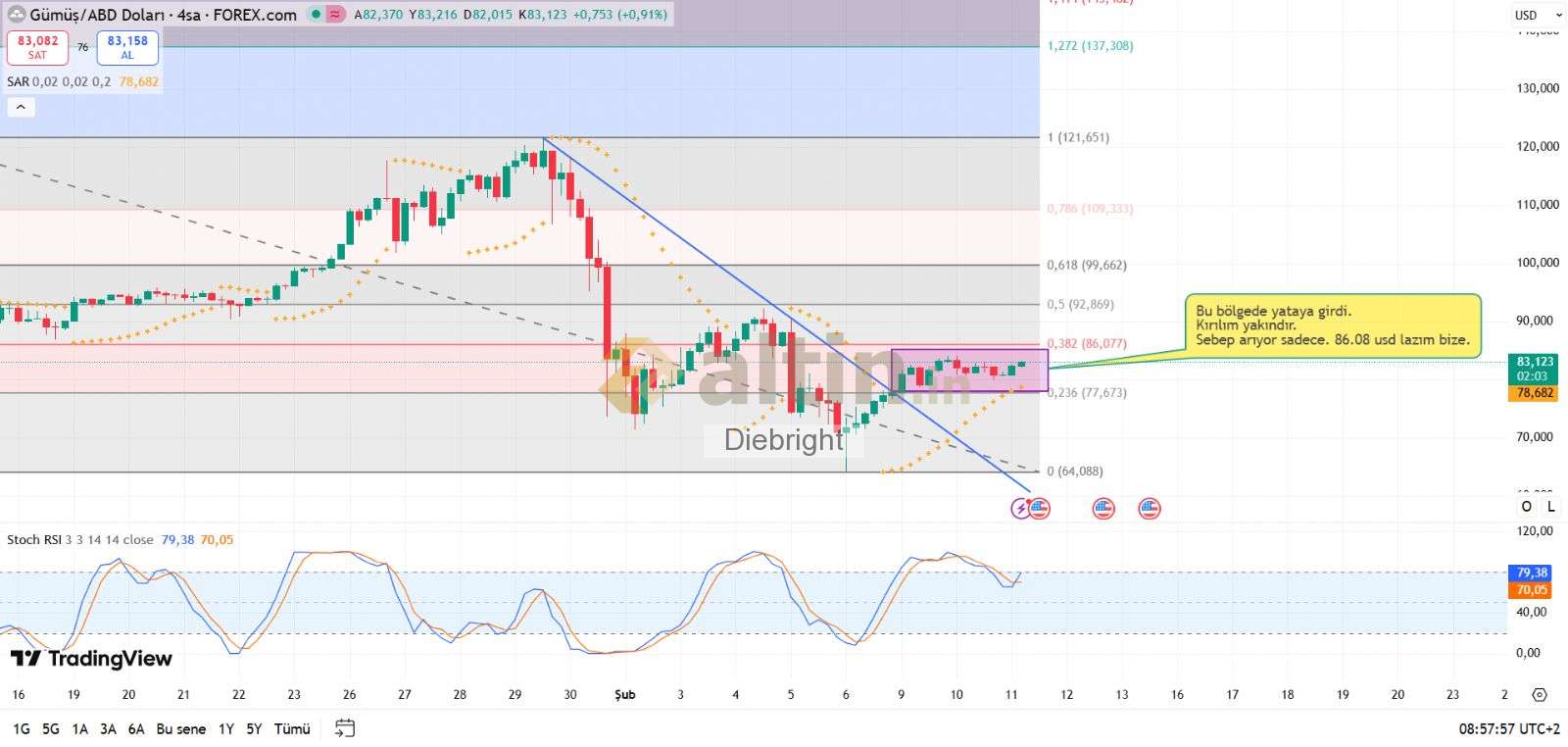Diebright ()Bakalım hala yatayda. Dışına çıkamadı. Fibo olarak da 86.08 usd ye henüz ulaşmadı. 4 saatlik göstergeyi bir miktar gevşetti. Belki bir ivme yakalar diyelim.
