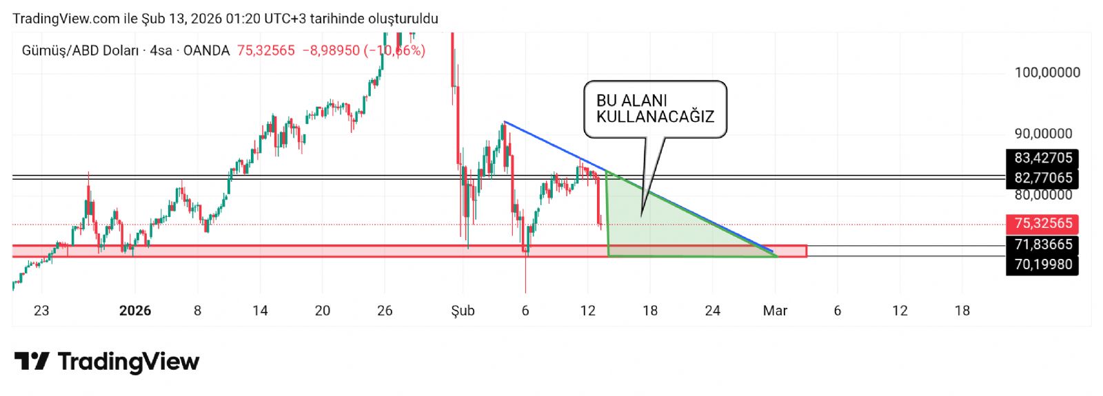 Hayalet_adam ()83 bantı da bir ihtimal olabilir ancak 82 ye kadar olan alan daha garanti arkadaşlar. Mavi hat düşen hattımız oluyor şuan. Kırmızı alan dip alım bölgesi 70-71 bantı.
