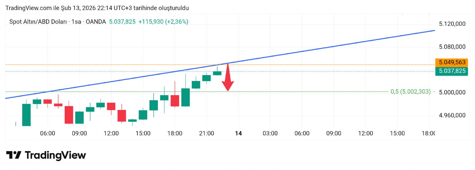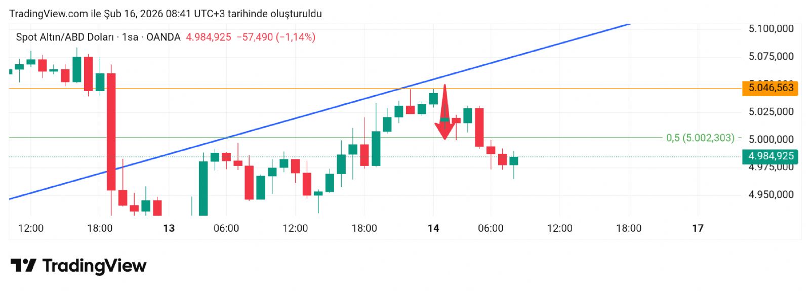 Hayalet_adam ()Kardeşim bazı ortalama değerleri de var 4938 bölgesinde bunlar ancak 5002 üstünde bu grafikteki direnç hattı ve 5143 direnç seviyesidir. 5002 Altın a 4860 değeri var alan olarak oraya kadar alan açık. 4938 noktasını takip edelim altında kalırsa bu dip değere iner üstünde kalırsa da 5002 dener şuan 5002 deneyecek gibi görünüyor kırıp kıramayacağına bakalım. Ben grafiği çizdiğim zaman 5002 dedim tepki almış 503x e kadar atmış ancak devamında tutamamış daha alta inmiş şimdi tekrar deniyor burayı. Destek dirençlerde takip etmek lazım şartlara göre bakılır. Umarım açıklayıcı olmuştur sizin için.