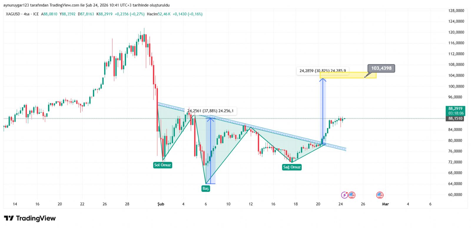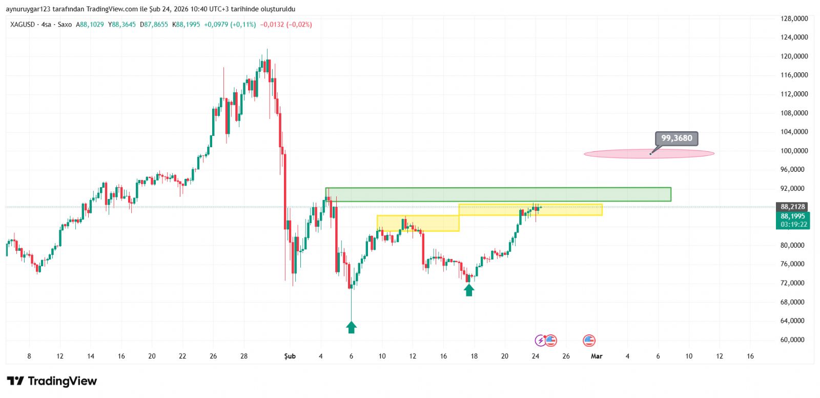 heisenbergg1 ()Abla son düşüşten önce toboyu 92 dolar a kadar bekliyorduk 88 dolarlardan geri düştü 71-72 destekten döndü bu dönüş ile birlikte yeni hedef 99 dolar oldu değil mi ? Birde şu an son görünüm nedir 99 görünüyor mu oradan dönüş görünüyor mu
