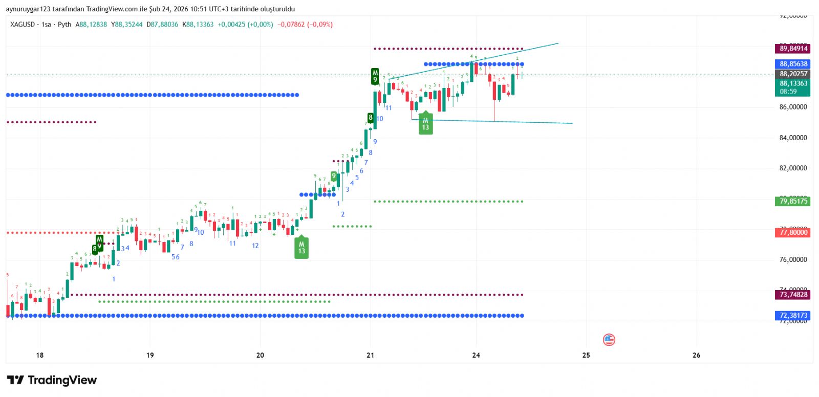Ali_Cesur ()Ne oldu bu ons a 87.70 indi geri çıktı 86, 85 ons a inmemmi diyor Aynur hocam.