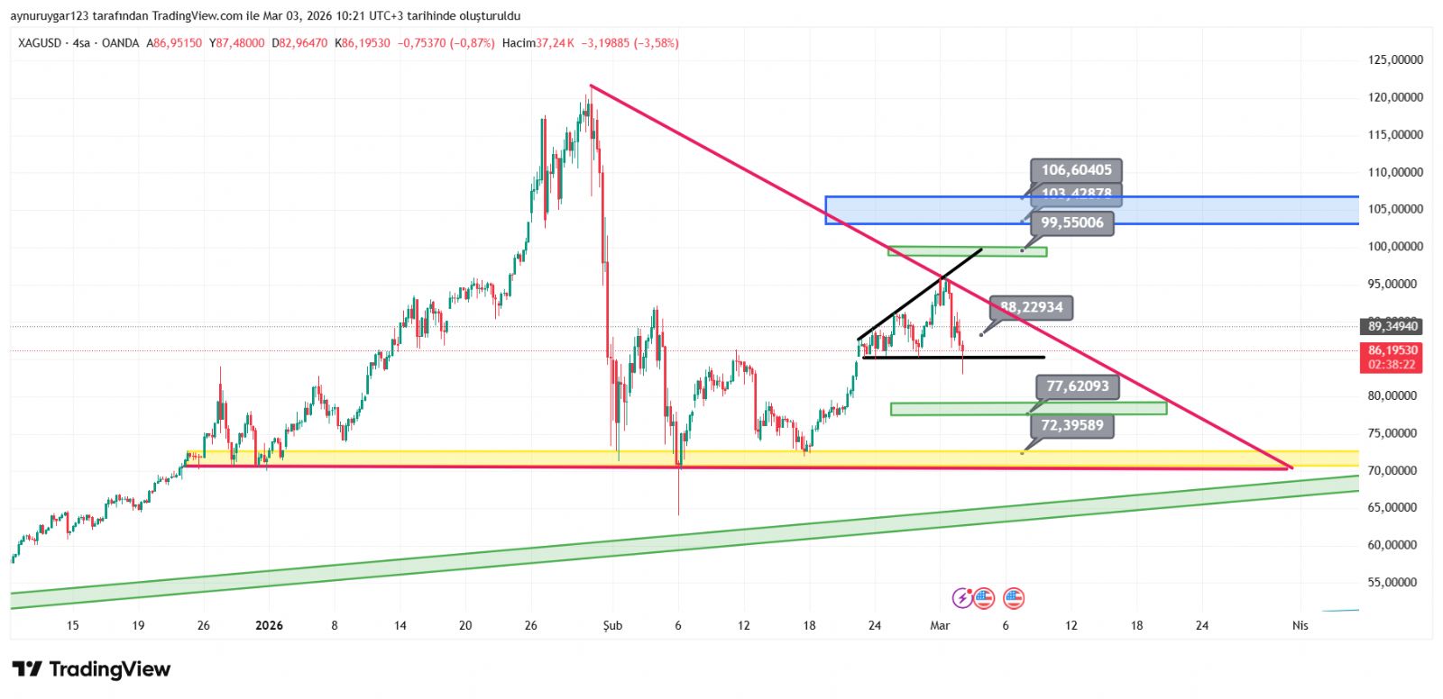 cihannüma ()altın bu seviyede iken gümüşte ikinci tepe ve üçgenin içinde kalma ihtimali olamamalı diye düşünüyorum, jeopolitik süreç te cabası.
