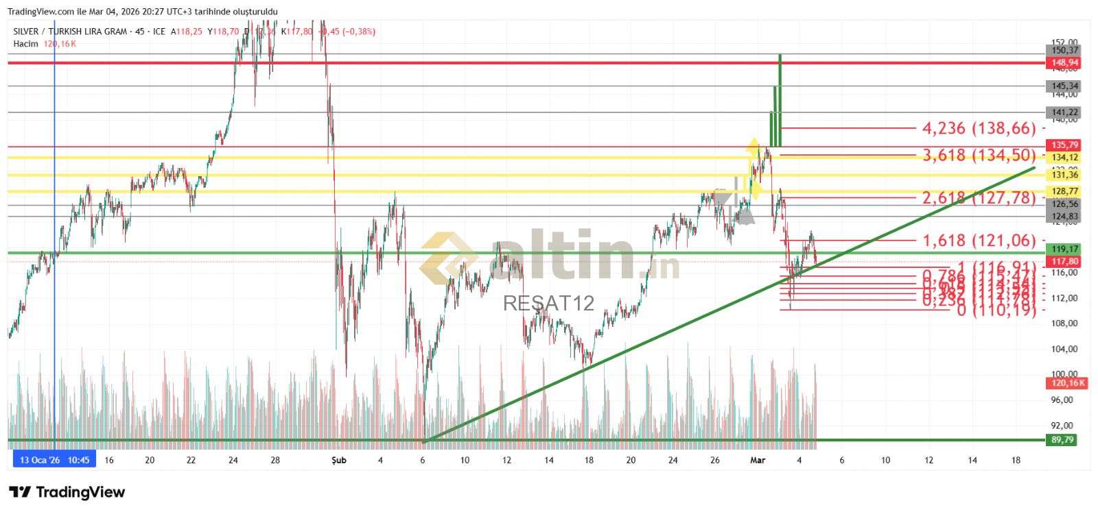 REŞAT12 ()13 Ocaktan beri 119 TL Altın da kalamamış ve yukarı sert dönmüş. Fiyattaki gevşemelerde aşağı doğru artan oranlarda alınıp bir kısmı satılmak suretiyle eldeki mal artırılırken ortalama düşürülerek devam etmekte fayda var. Alt seviyelerde gram ortada geri dönüş ihtimalinden dolayı hem gram hem TL üst seviyelerde de geri dönüş ihtimali yüksek olduğundan sadece TL artırarak devam inşaallah. Toplamda gram eksiltmek gibi bir şey düşünülemez sonucu sadece zarar ve enflasyon karşısında kayıp olur. Şu ana kadar dolar TL zayıf hareket ettiği için dolarla işlem yapanlara zarar yazdı. Ytd.
