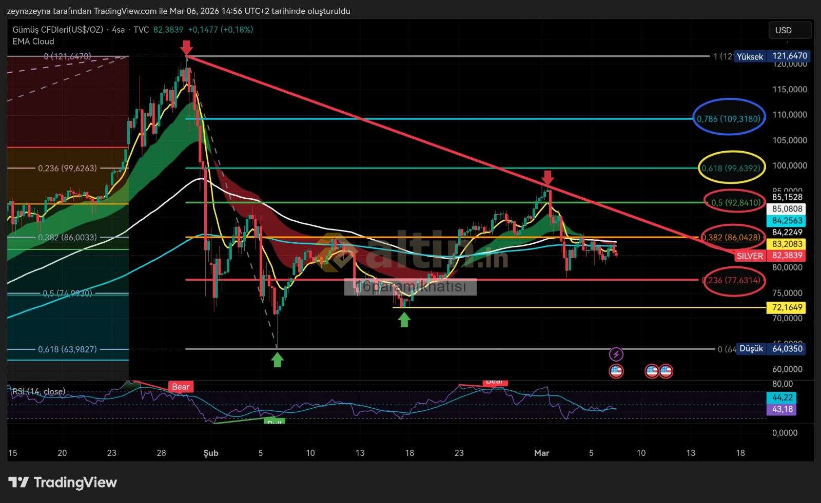 16paramıknatısı ()Geçen hafta Zirveden gelen düşeni ve fibo %50 seviyesi 92.8 kapanış alamayınca destekleri yokladı Ons gümüş fibonacci 86 direncini aşamdıkca alt destekler grafikte