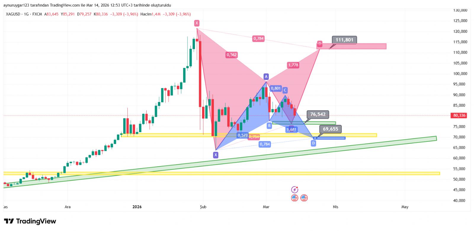 cihannüma ()Dxy Haftalık dirençteyiz, dönerse 75 ons iğne olarak kalır, dönmese az daha yukarı çıkarsa 69 a inş, iğne gelir. Dxy haftalık sağlam direnç dönmesini beklerim.