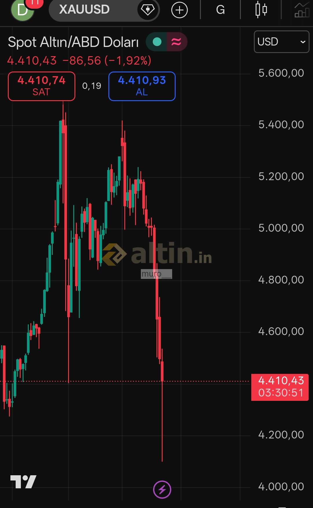 23 mart 2026 ons altın 4.410 dolar.