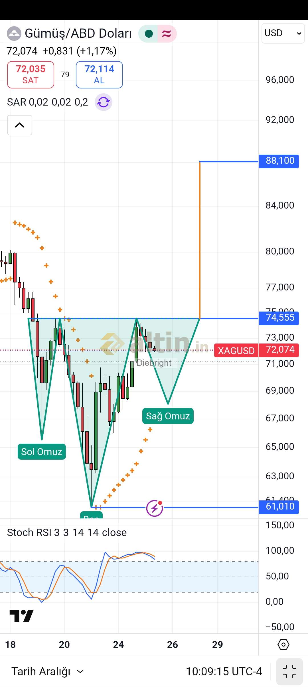 Diebright ()Buralarda yatay mumlar sıralanırsa görüntü bozulabilir. Sağ omuz oluşmaz görüntü de bozulur. Sağ omzu kisa tutup gider 74.55 usd yi kırabilir. Yatay mumlar gelmesin 61 usdye düşmesin bunun haricinde formasyon aktif devam eder.