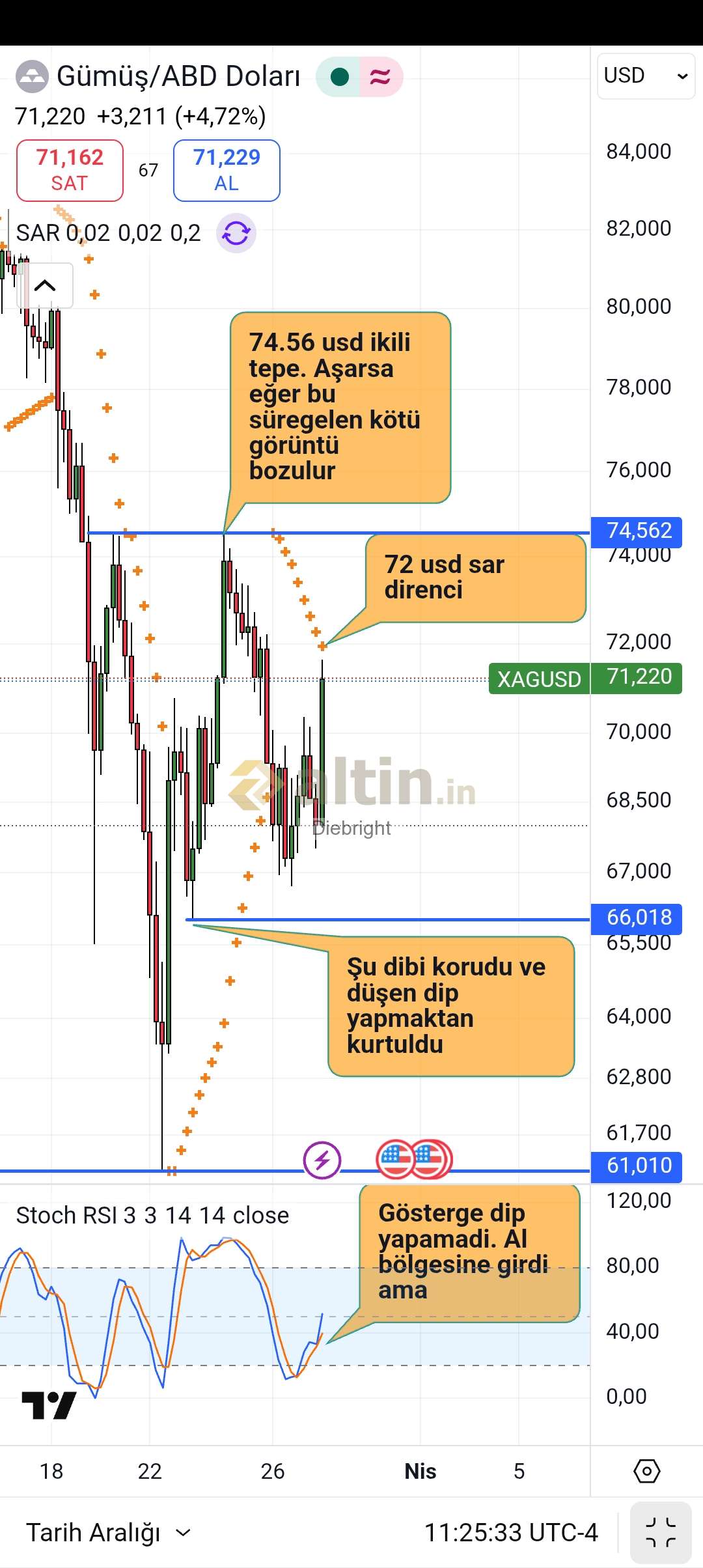 Diebright ()Önünde 72 usd direnci var. Ancak esas direnç ikili tepe yaptigi ve iki kez sert satış yediği 74.56 usd. 74.56 usdyi ması halinde ekleme yapılır ve hedefi yaklaşık 88 dolar gibi bir yerler olur.
