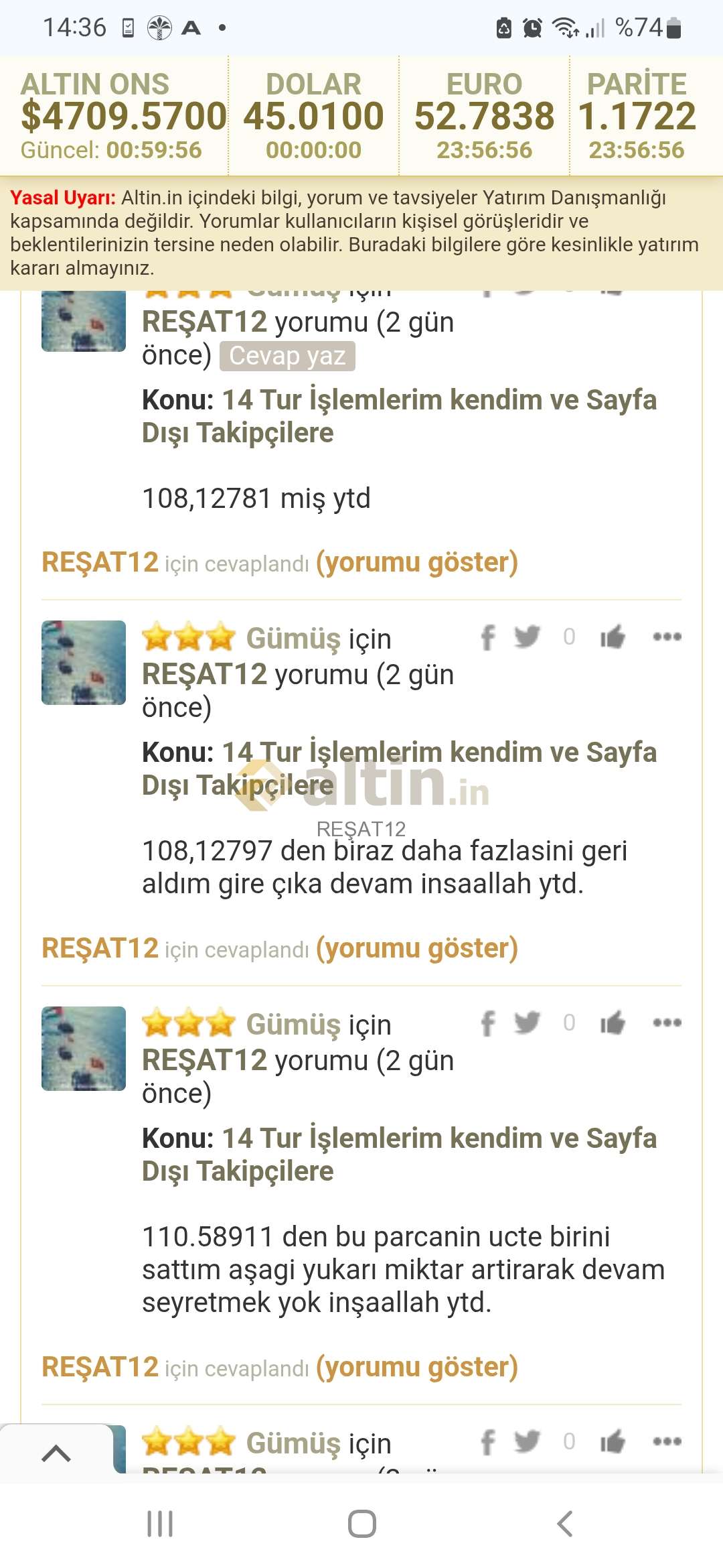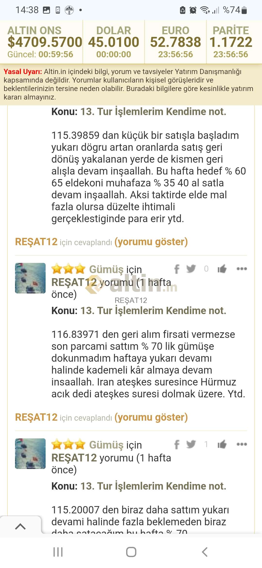 REŞAT12 ()Bu kadar dikkatli grafik takip eden biri nasıl oluyor da 136 Tl yi ve 84 TL yi gördügünü soruyor ? Dipten almaktan tepeden satmaktan bahsediyor ? 17,50 dolar dan bu kadar zamanda 75 dolari gecmis bir ürunde uzun vade kazanilacagıni nasılsoyluyor ? Enflasyon ? Ben ne yazdiysam ispat ettim 168.85 ten satip 162 üstüde ful TL ye gectigimde de mundar olan mal elde tutulmaz diye defalarca ikaz eden mabuzla 89 Tl ye kadar bütun al satlarımi paylaştım ytd
