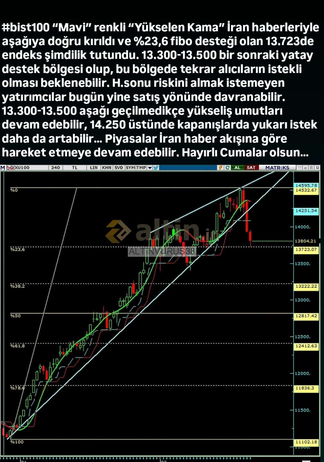 ALTINVURUŞ38 ()Haftanın son işlem günü, gününüz bereketli olsun hayırlı cumalar arkadaşlar, 2 gündür İrran bahanesi ile iyi düzeltme yapıyorlar küçük yatırımcıyı döke döke bıktıra bıktıra devam ediyorlar ne zaman iyice ky azaldı ozaman tavan serilerine bağlarlar bu seferde yükseldi şimdi düşerse diye korkusundan işlem yapamaz ky, sonra baktı herşey yükselip gidiyor trene bende bineyim der ky sonra 2 kaşık bal çalıp aha kazanıyorum bende derken herkesi ters köşe yaparlar onun için bu sıralar izleme tarafında kalıp trendi devam eden önü açık dediğiniz güzel düşüş yaptı fırsat bu fırsat dediğiniz kağıtlar için nakit bulundurunuz mesela savunma hisselerini radaarınıza alın bu sıralar İrran tarafı gerginlik artarsa savunma ve emtia kağıtları hareketlenir buna benzer fırsatlar oldukça değerlendirin marttan sonra giderek genele yayılan bir borsa izleyeceğiz deyim yerinde hiç anlamayan bile kazanacak nerdeyse :) o zaman gelene kadar nerde fırsat var sizde orada olunuz sekktör vs açısından haydin kalın sağlıcakla :)