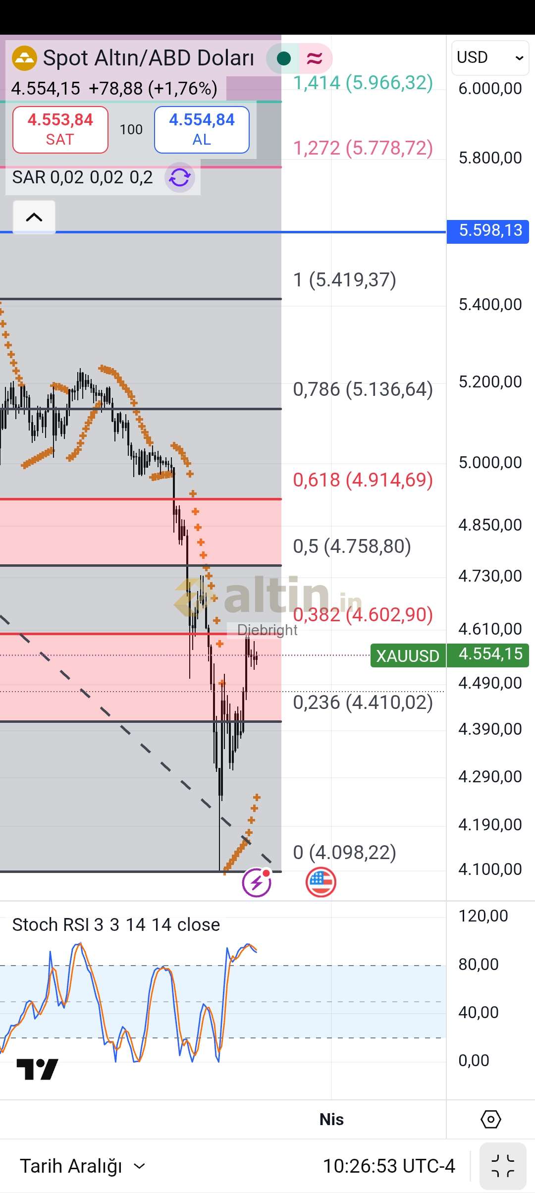 Altın onsta da 4410 usdye dün dikkat çekmiştim. Açıkçası biraz geri çekilir diye düşündüm. Aksine gece gelen haber ile 4410 hacimli geçildi ve bir sonraki fibo olan 4603 usdye bire bir dokundu. Sonraki 4 saatlik mum da 4603 usdden red yedi az geri çekildi. Eğer 4603 usdyi geçerse sonraki hedefi 4759 usd olacak altında. Onslarda 4 saatlik göstergeler aşırı alimda ancak tam da tepede değil. Günlükler de al veriyor.