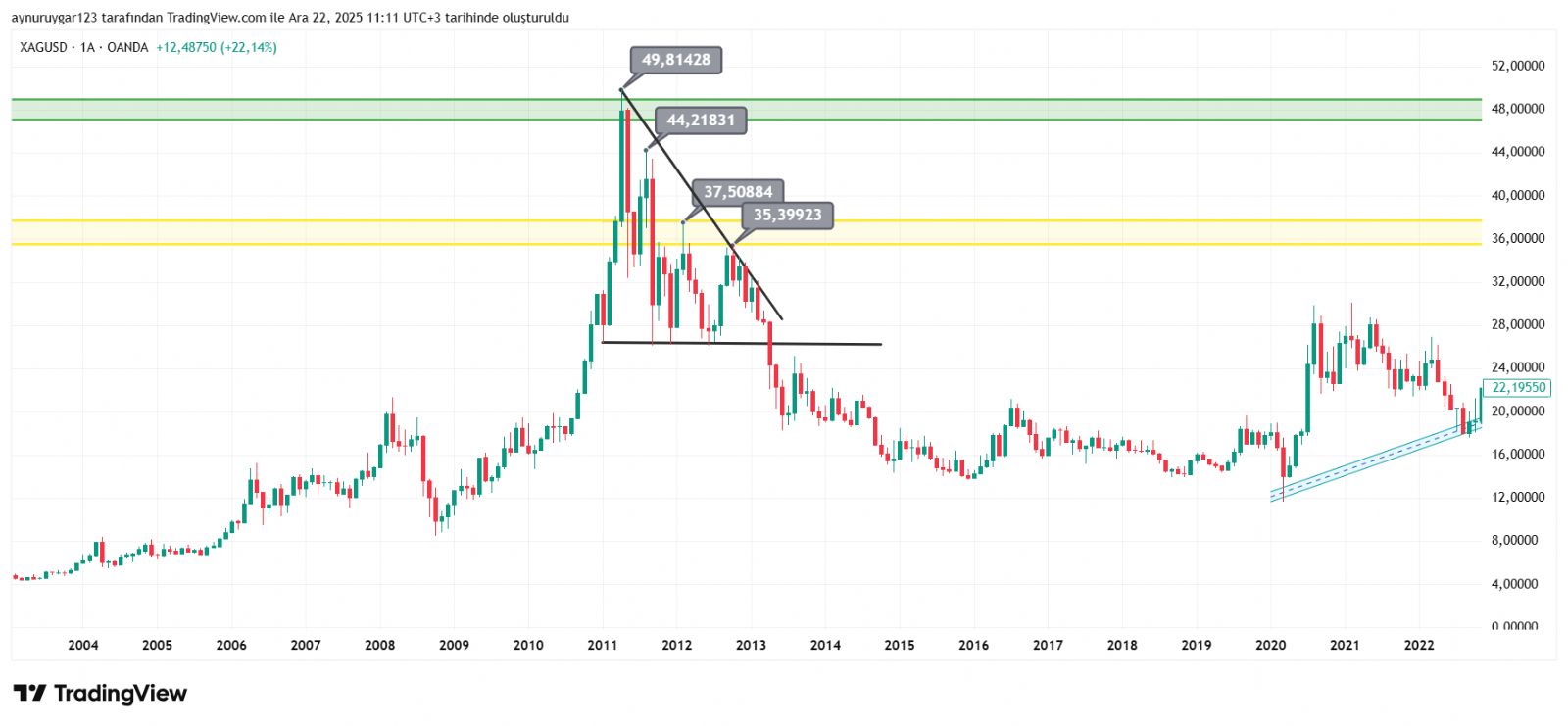 49 doları gören gümüş haftalık ve aylık mumda alçalan fiyat harektı sergiliyor 2 sene