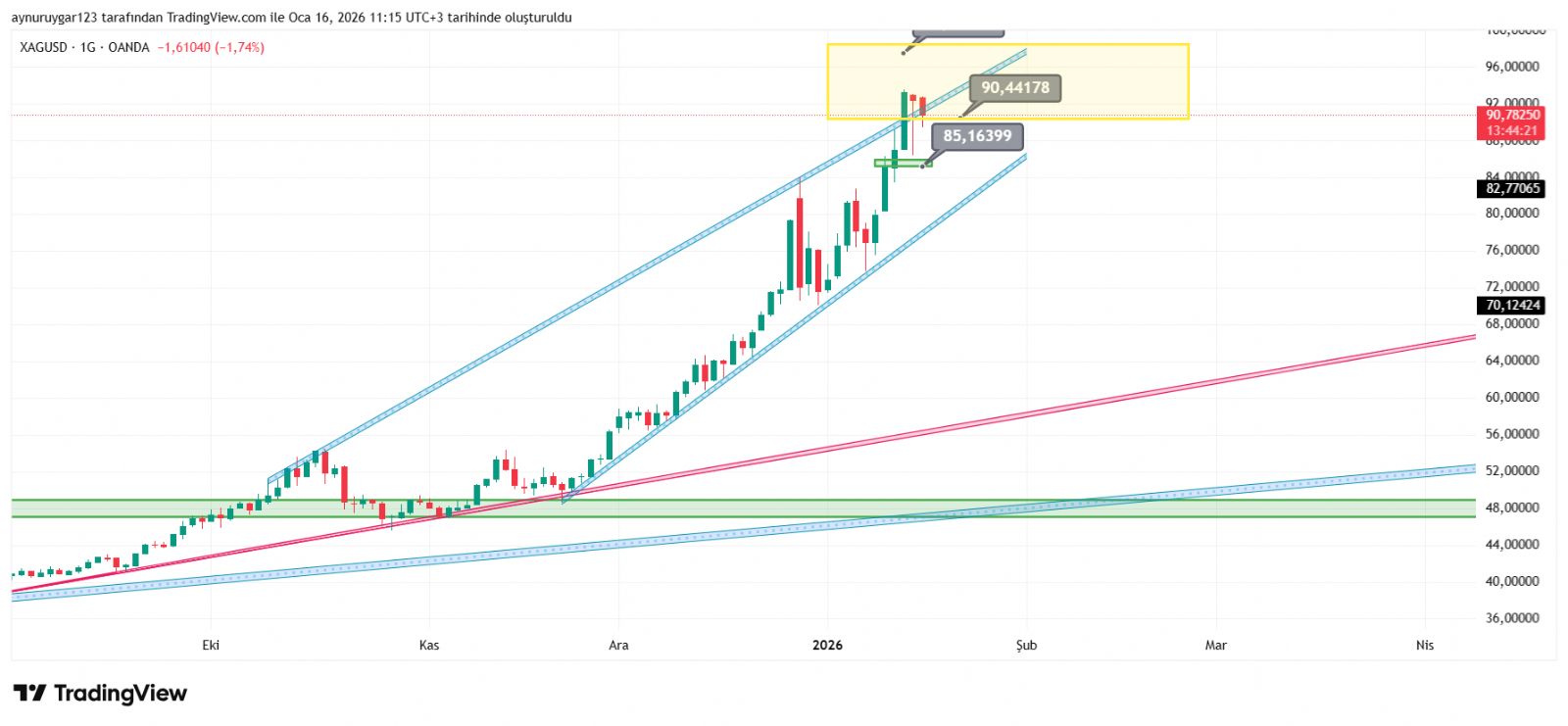 geçenlerde megaön yukarı kırmıştı .. amma o zamanlar ucuzdu gümüş .. şu an çok risikli olabilir .. belki 110..120 olabilir amma 4 kat 5 kat düşebilen bir ürün gümüş
