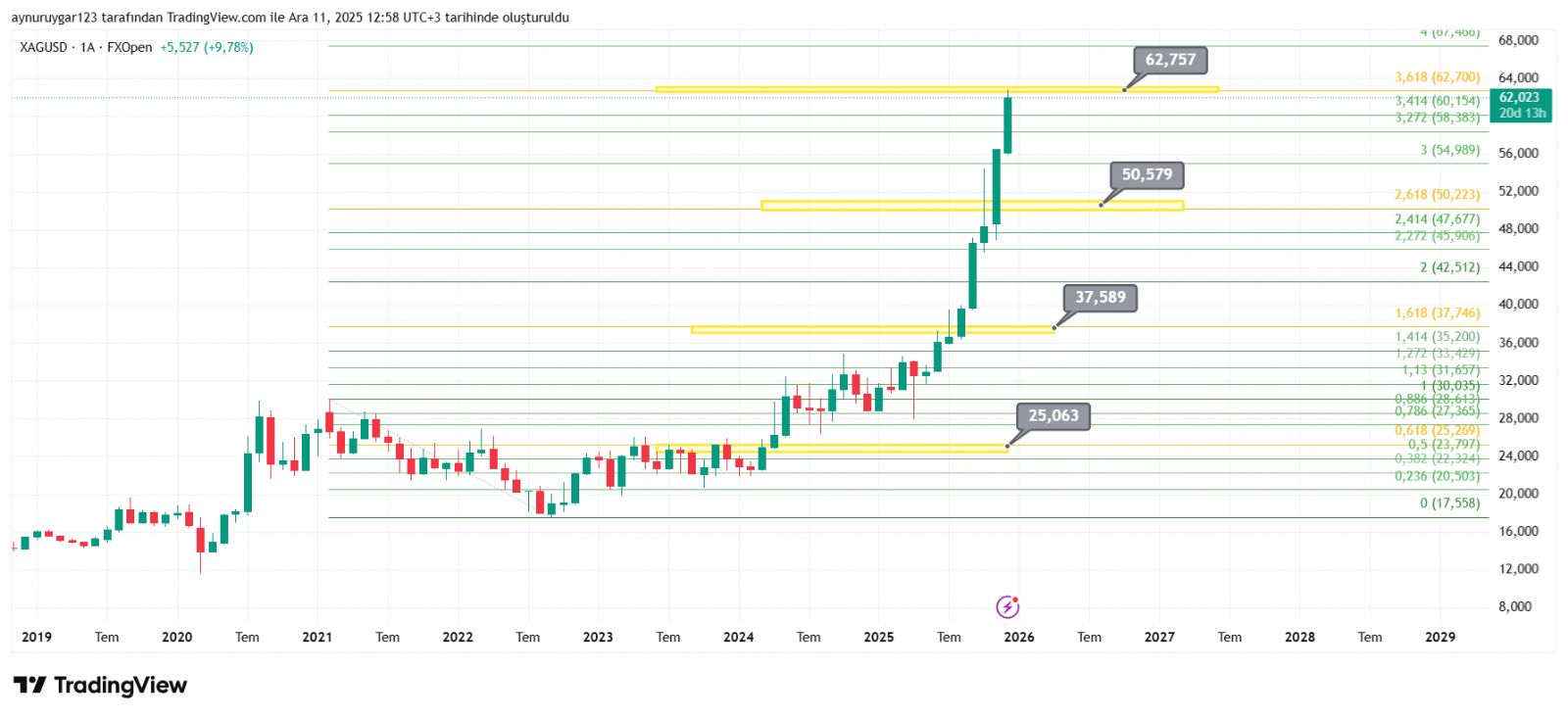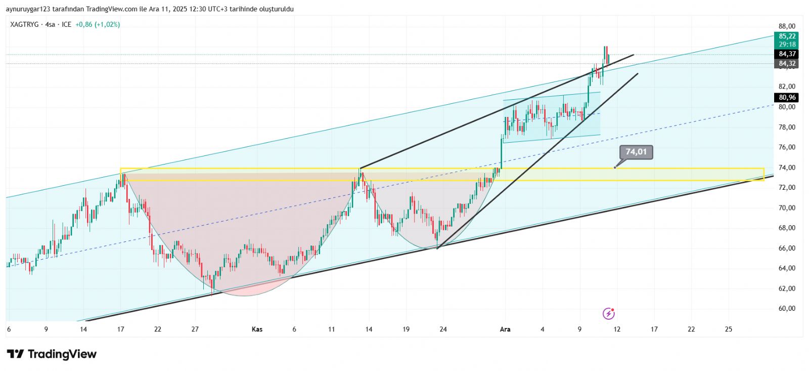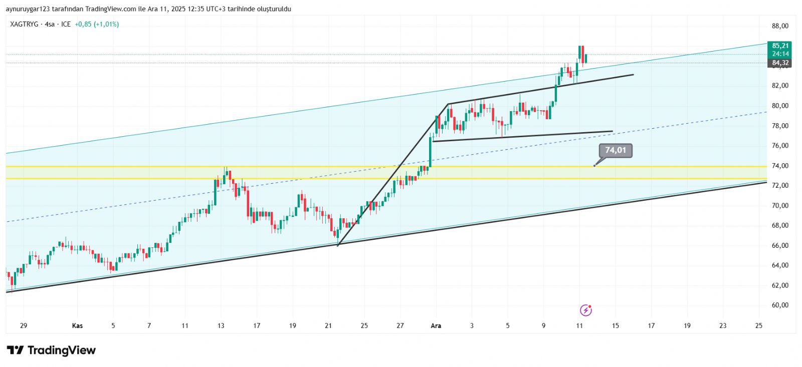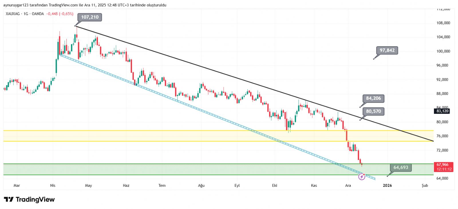 Altın_Kokusu ()Tehlikeli yani bu her zamanki gibi değil. Yıllar içinde bakın böyle pik şeklinde zirve yaptığı zamanlardan sonra gireceksiniz ki Keskin ve sert düşüşler kısa sürede olup uzun süreler dillerde yatay vaziyette kalmış gümüş yıllarca. He yükselmeye devam eder mi edebilir de. Fakat uyarmakta fayda var 3 lu rakamı kim konuşur bilemem ben teknik olarak bir şeyden bahsettik. Yutan ay. ve ortalamaları çok aşmasını hafife almamak lazım bunlar çok basit şeyler değil. Sonuçta herkesin kendi kararı ytd.