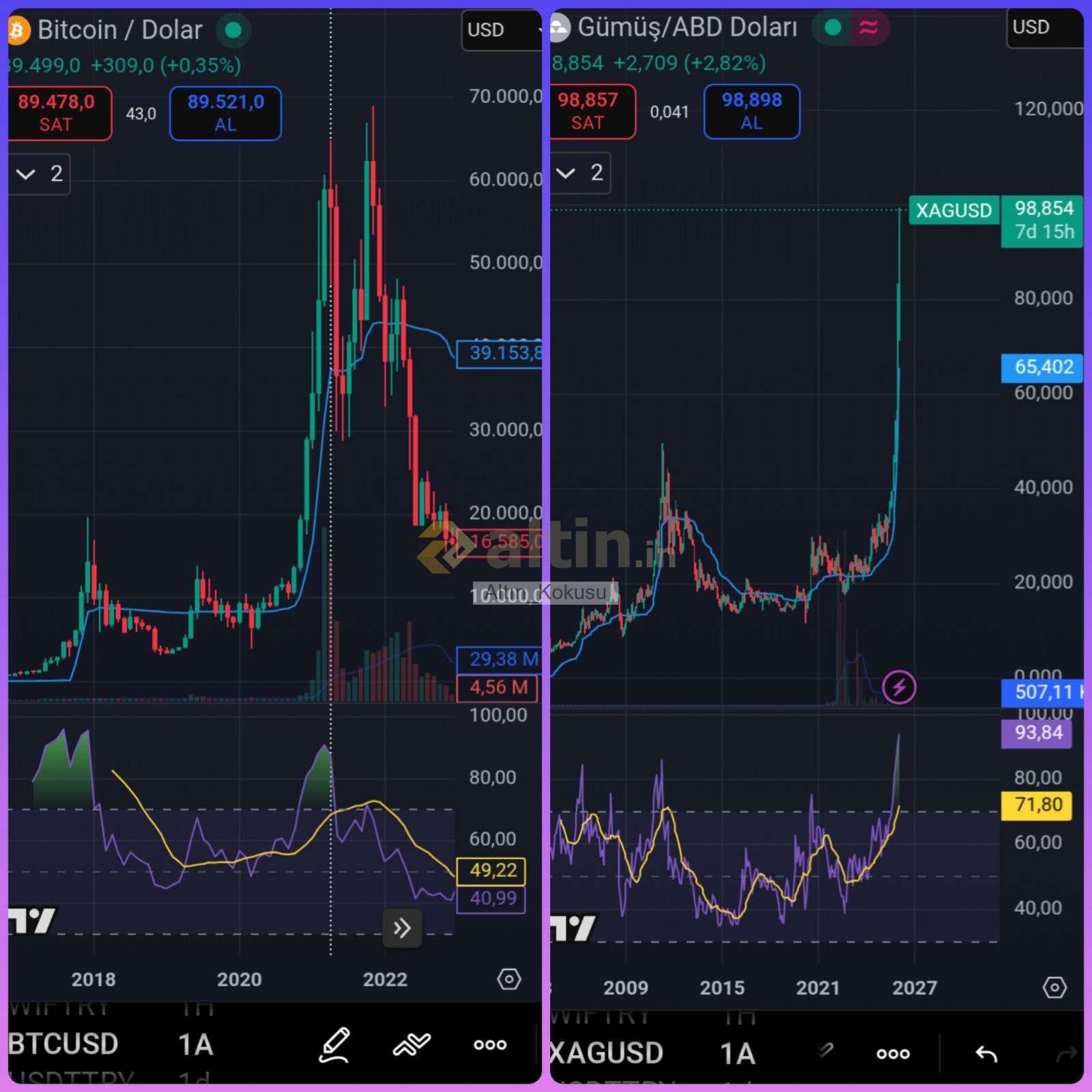 Değerli dostlar gümüş ons ile b.t.c nin aylık uzun vade grafiğinde benzerlik kıyaslaması yaptım.