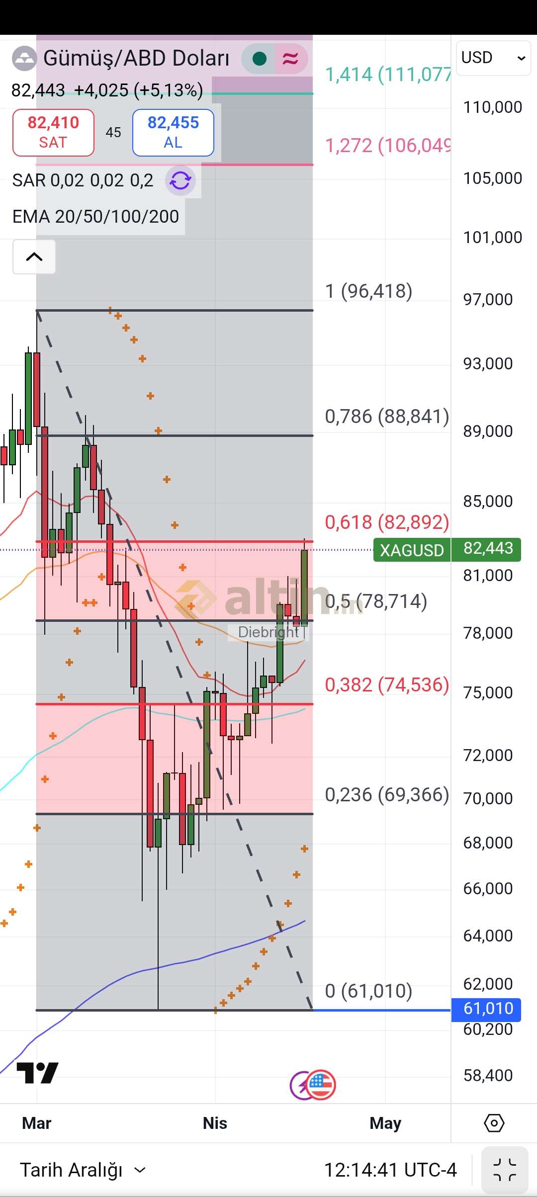 4 saatlik düzeltme yaparsa yine 78 usd civarı bir yer. O hep beklediğim gunluk düzeltme yaparsa 74.54 usd. Henüz bir yönelim yok. 82.89 usdyi iki kez denedi geri çekildi. Tekrar deneyecek mi bakacağız. Alt seviyeleri direnç kırılmaz ise takip edeceğiz.