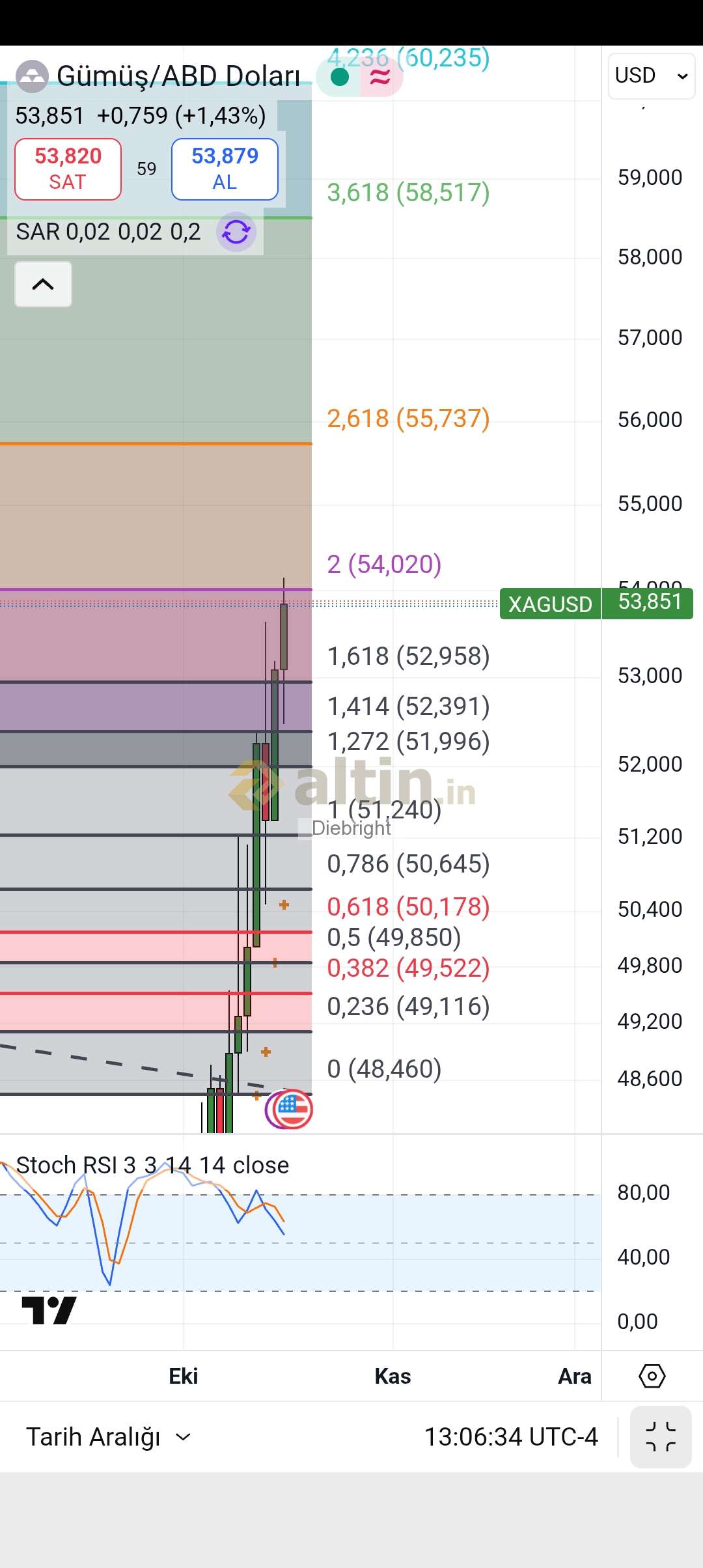 54.02 usd az ustune iğne gelmiş. Gosterge ve fiyat arasında negatif uyumsuzluk devam ediyor. Ancak uyumsuz uyumsuz da devam eder yükseliş olabilir.