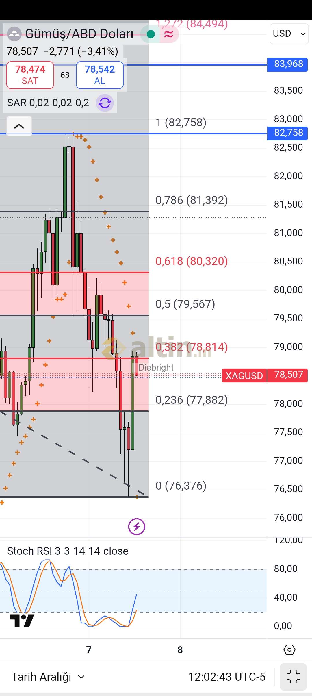 Son düşüşün geri dönüş seviyeleri. İkinci tepki 78.81 usd seviyesine gelmiş. Devamında bir sonraki seviye 79.57. Saatlik ve 4 saatlige göre gelmesi gerek. Günlükte yukarı hareket devam edecek.