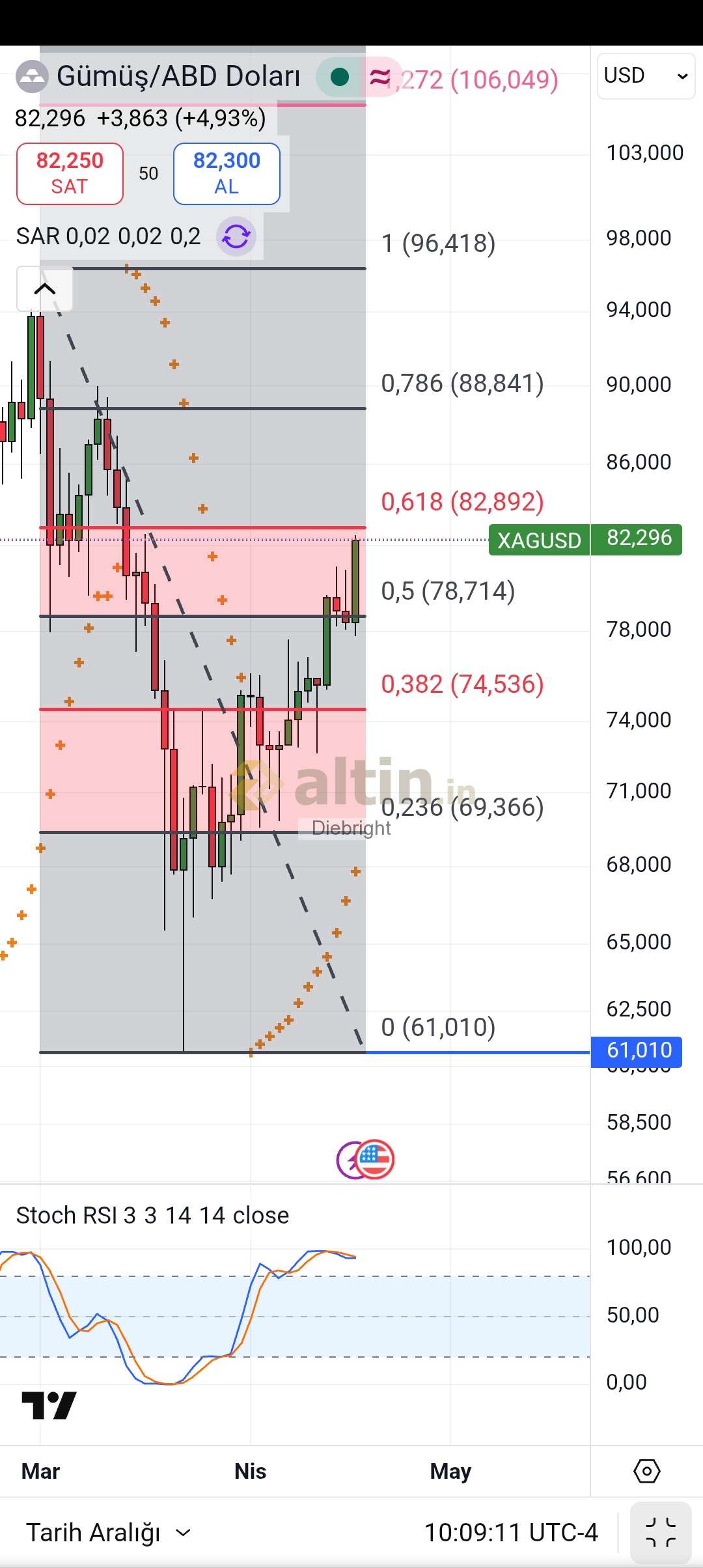 78.71 usdden destek almaya devam etti ve 82.89 usdyi zorlamak üzere. 96.41 usdden 61.01 usdye düştük. Fibo 0.618 seviyesi 82.89 usd. Kritik. O yüzden kırmızı hat ile çizili bende. Geçerse 0.786 seviyesi ihtimali güçlenir. Bu yüzden 82.89 önemli. Yeni bir alan açar. Sabaha doğru 112.6x tl akşama doğru 118.9 tl gordu. Gümüşü iyi takip eden güzel kazanır. Çok şükür bu hafta da az çok kâr verdi. Bir umut 4 saatlik ve günlüğü aşırı alıma getirip haftaya alım fırsatı beklerim. Elde az miktar bıraktım. 82.89 usd ihtimali için.