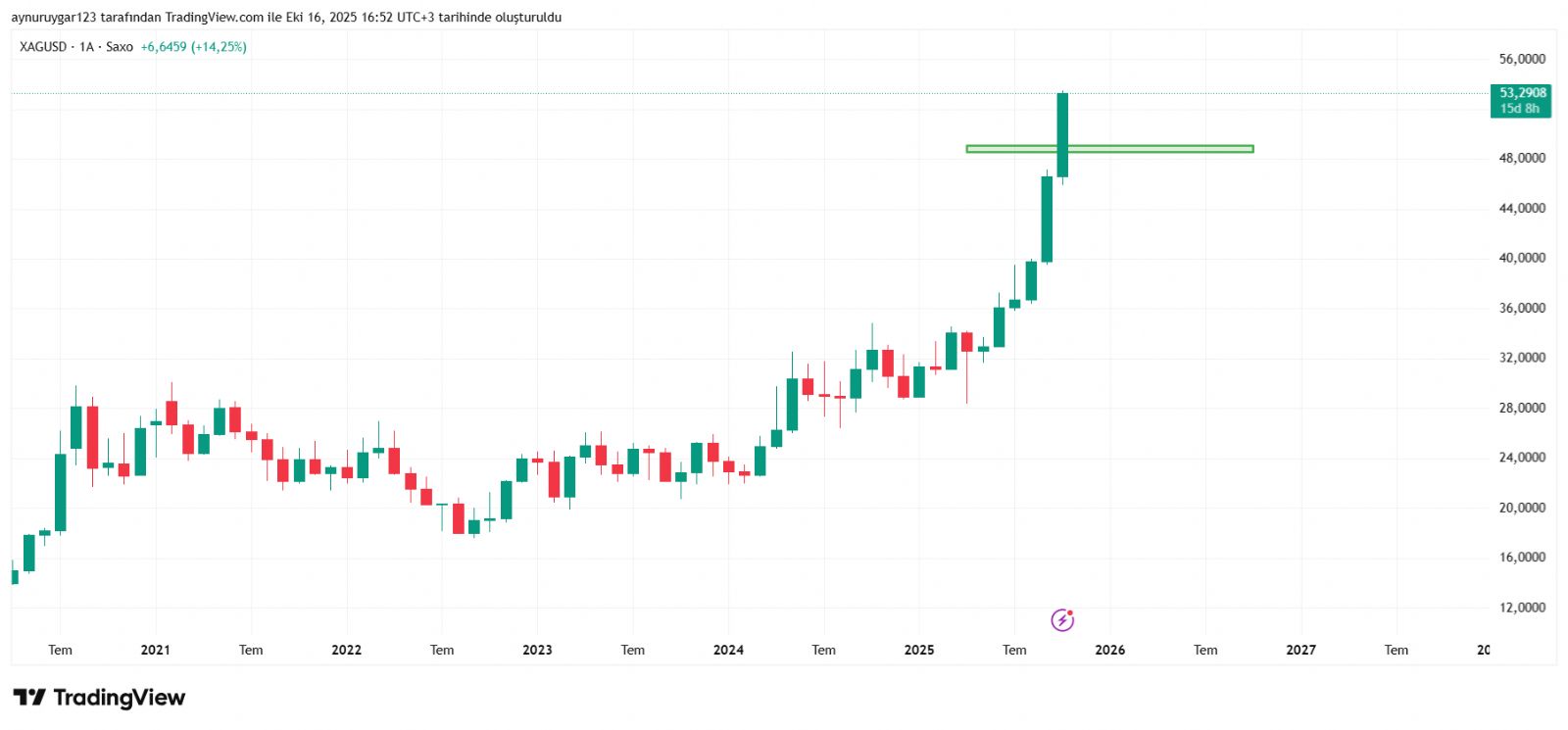 Bekleyin 55 56 dolar ons gümüş uzmanların söylediği oralarda düşüş satış öngörüyoruz diyorlar bende 47 48 dolarken sattım ytd.