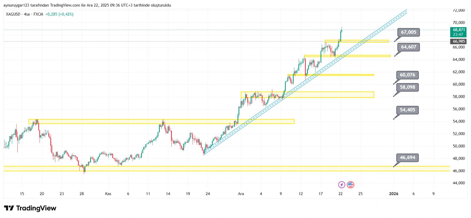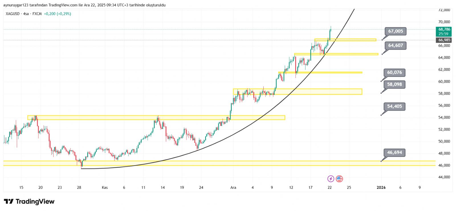 Acemi_dövizci ()Gümüş yeniden rekor tazeledi. Son dönemde peş peşe zirve yenileyen gümüşte ana senaryomuz, yukarı yönlü hareketin devam edeceği yönünde. 66,86 – 67,43 bölgesi üzerinde kaldığı sürece görünüm pozitif; bu bandın üzerinde 70 psikolojik direncini takip ediyoruz. Öte yandan yükselişin sert olması nedeniyle olası düzeltmelerde geri çekilmeler zaman zaman derinleşebilir. Alternatif senaryoda 66,86 – 67,43 bölgesinin aşağı kırılması halinde fiyatların 66,08 seviyesini gündemine alması beklenebilir.