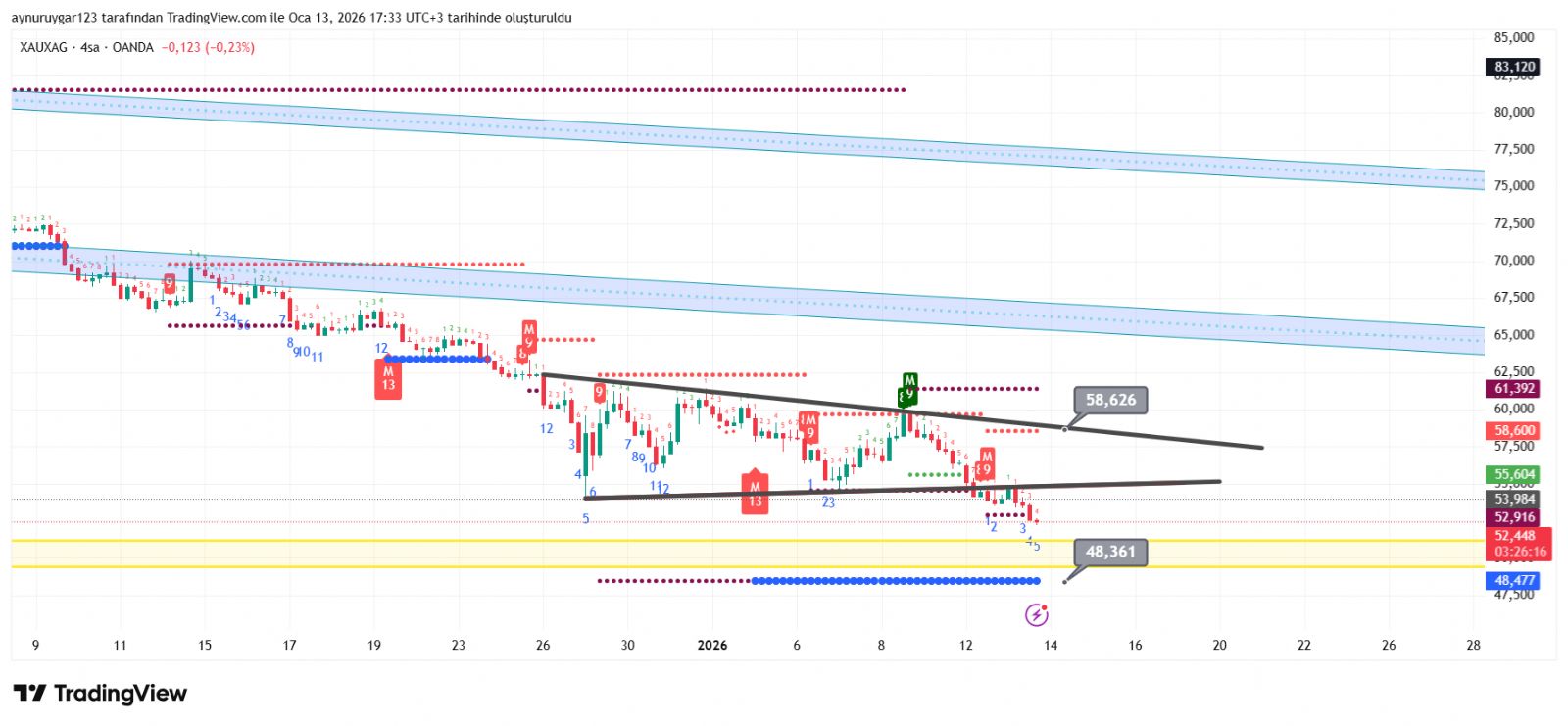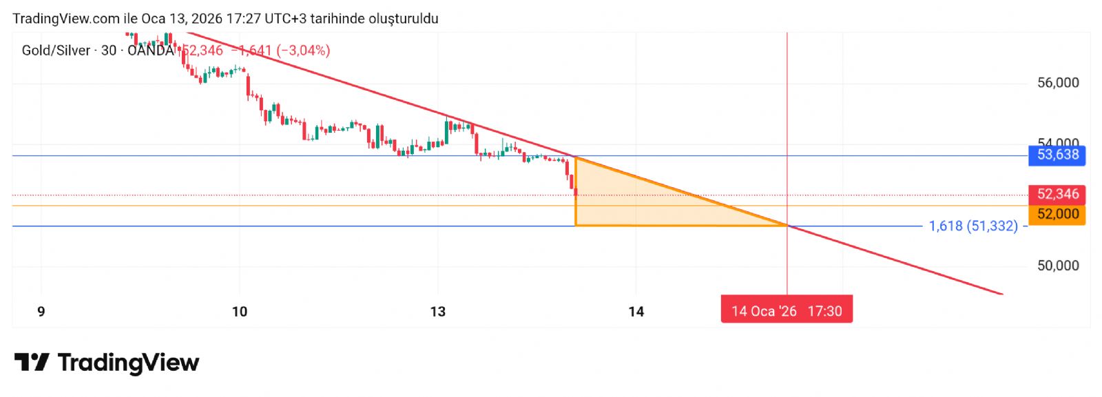 Rasyo kısada hareket alanı. Üçgen içine aldığım alanda devam edeceğini düşünüyorum. Sonra buradan da çıkış yapacaktır ama ne tarafa bilmiyorum. Yakalamaya çalışıyorum. Bir ihtimal oradan sonra artık düşeni üste kırması beklenebilir. Yinede takipte kalarak bakmak daha doğrusu olur.