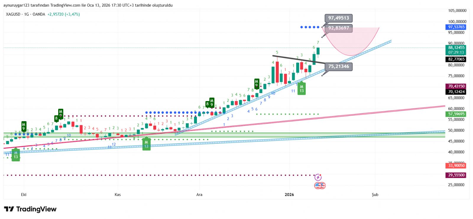günlük 97.53 mavı noktalar günlük stoplos ..yanı 92 ve 97.53 aşarsam sat vermeyin dahada yükseleeğim diyor ...