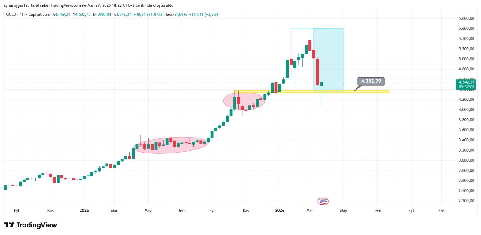 Altın ons tarafını dikkat edelim. 4500 altına salmamali. 4600 - 4685 usd..