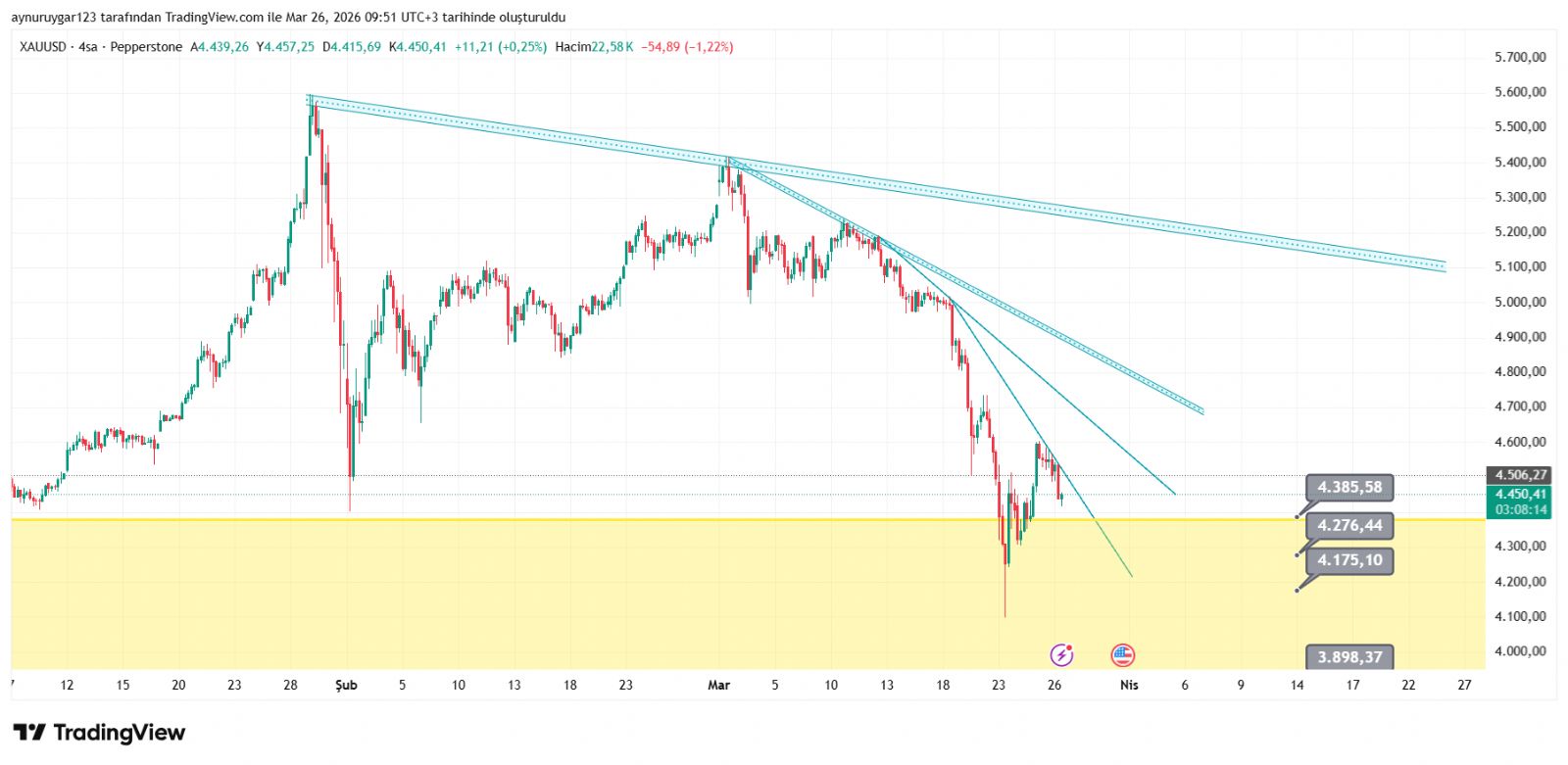 Altın ons için güçlü tepki alım yeri bende 4350 - 4300 gözüküyor bi bakar mısın zahmet olmazsa kırılırsa 4200 e kadar sarkma ihtimali var ancak tepki alımı olursa 4450-4500 yeniden test edilir tutunursa üzerine atma ihtimali olabilir.