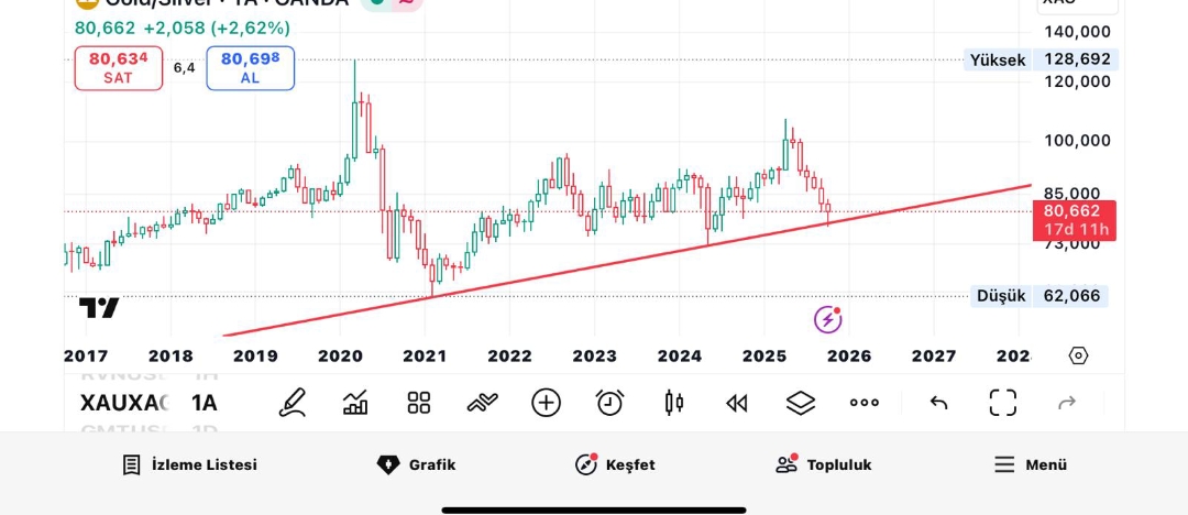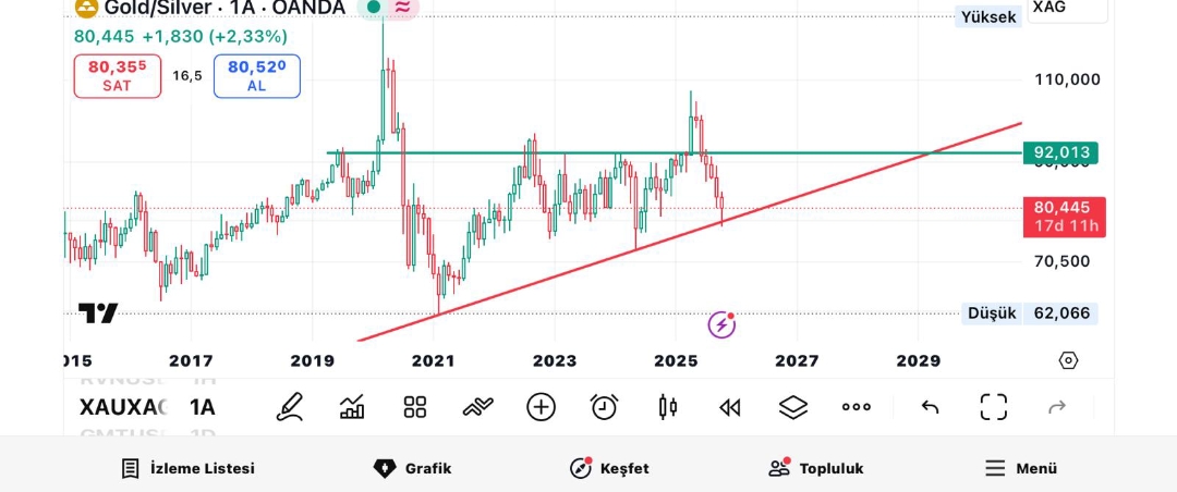 İşte bu hatta temas sağlandı. Bu hatta temas sonrası sert yükselişler oldu daha önce ve bunu 2024 te 72.6 ile noktasal yakaladım. Şimdi 77 dedim burası ve geldi gelmesini de çok istedim buraya kadar gelmişken değsin dedim ama buradan sonrası sıkıntı. Bu trend hattı bana göre çalışacak ve sert bir yükseliş gelecek buradan. Ons altının ne yapacağı da önemli tabi. Eğer orası da aynı anda düzeltme gelirse ons gümüş buraya bağlı olarak çok sert inebilir. Ons altın tarafı şuan aşırı sert bir iniş işareti yok ama düzeltme olarak bile inse yeterli olur gümüşte geri çekilme için diye düşünüyorum.