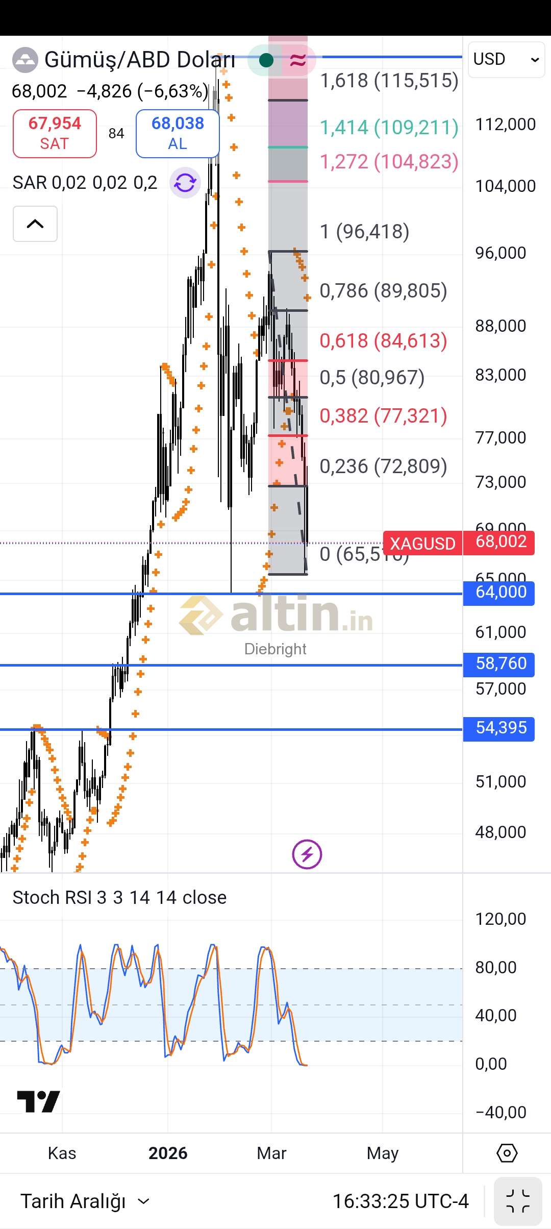 64 dolar desteği kırılırsa altta kabaca 58.76 ve 54.4 usdler iyi destek yerlerdir. Olur da gelirse buralardan sert yukarı tepki alır. Şimdilik 64 ve 65.5 usd diplerine odaklanalim.
